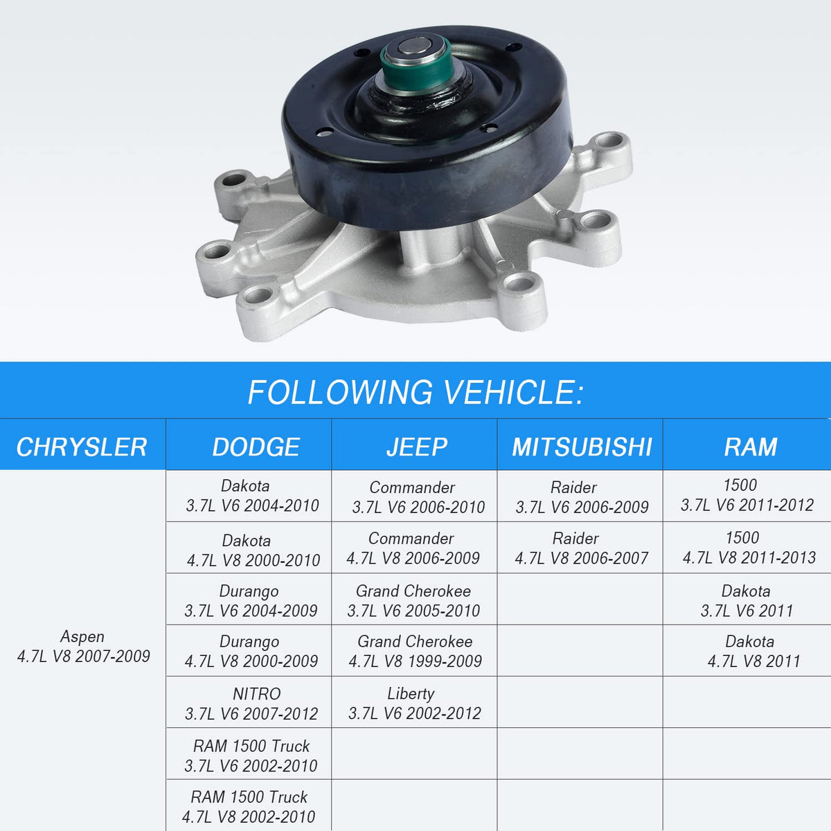 Water Pump With Gasket 1204350 Aw7163 Replacement For Commander Dodge Ram 1500 Dakota Durango Replacement For Grand Cherokee Liberty Chrysler Aspen Replacement For Mitsubishi Raider 3.7L V6 4.7L V8