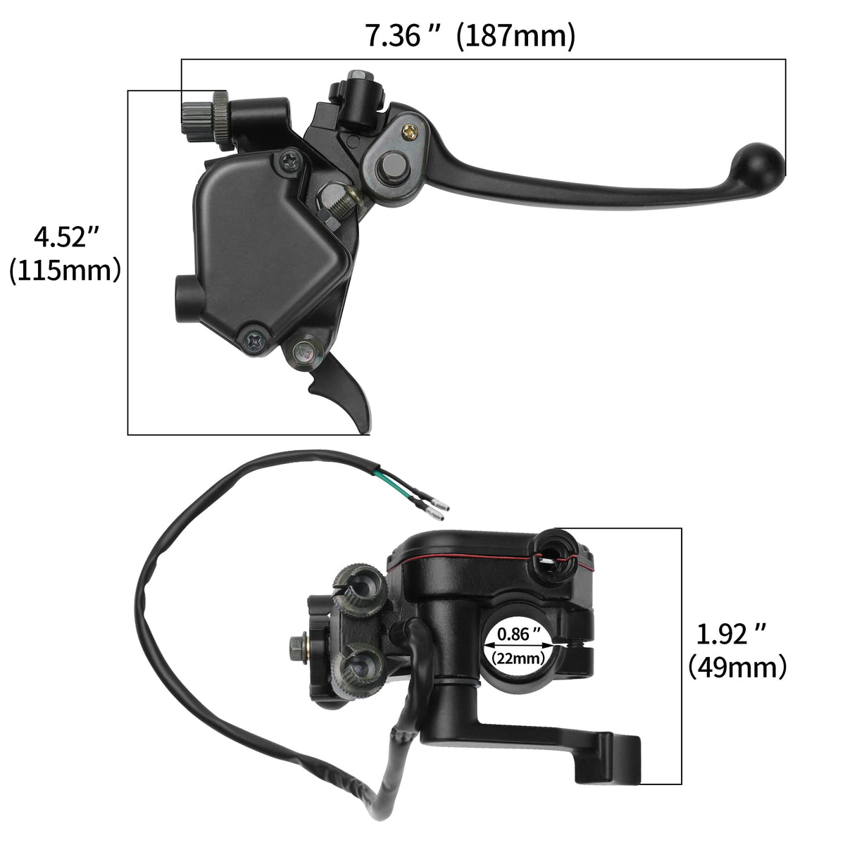 Specifications: 22mm mounting hole inner diameter(about 7/8") Brake switch: with, the switch is off in normal position. Cable length: 17.7" (450mm) Connector: 2 X 3.5mm Diameter Bullet Crimp Terminal Male Socket