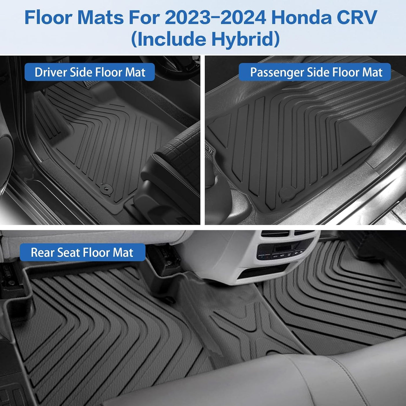 Product Specification: Material: 100% Brand-new Thermoplastic Elastomer (TPE) Type: Custom Made Safety : Non-toxic. BPA Free. Odor: Odorless Color: Black Package Dimensions: 29.53*22.05*6.69inch Compatibility: Fits for 2023 Honda CRV Include Hybrid Fits for 2025 2024 2023 Honda CRV Include Hybrid Products Include: 1 x Driver-side Floor Mat 1 x Passenger-side Floor Ma 1 x Rear Seat Floor Mat 1 x Rear Trunk Matt