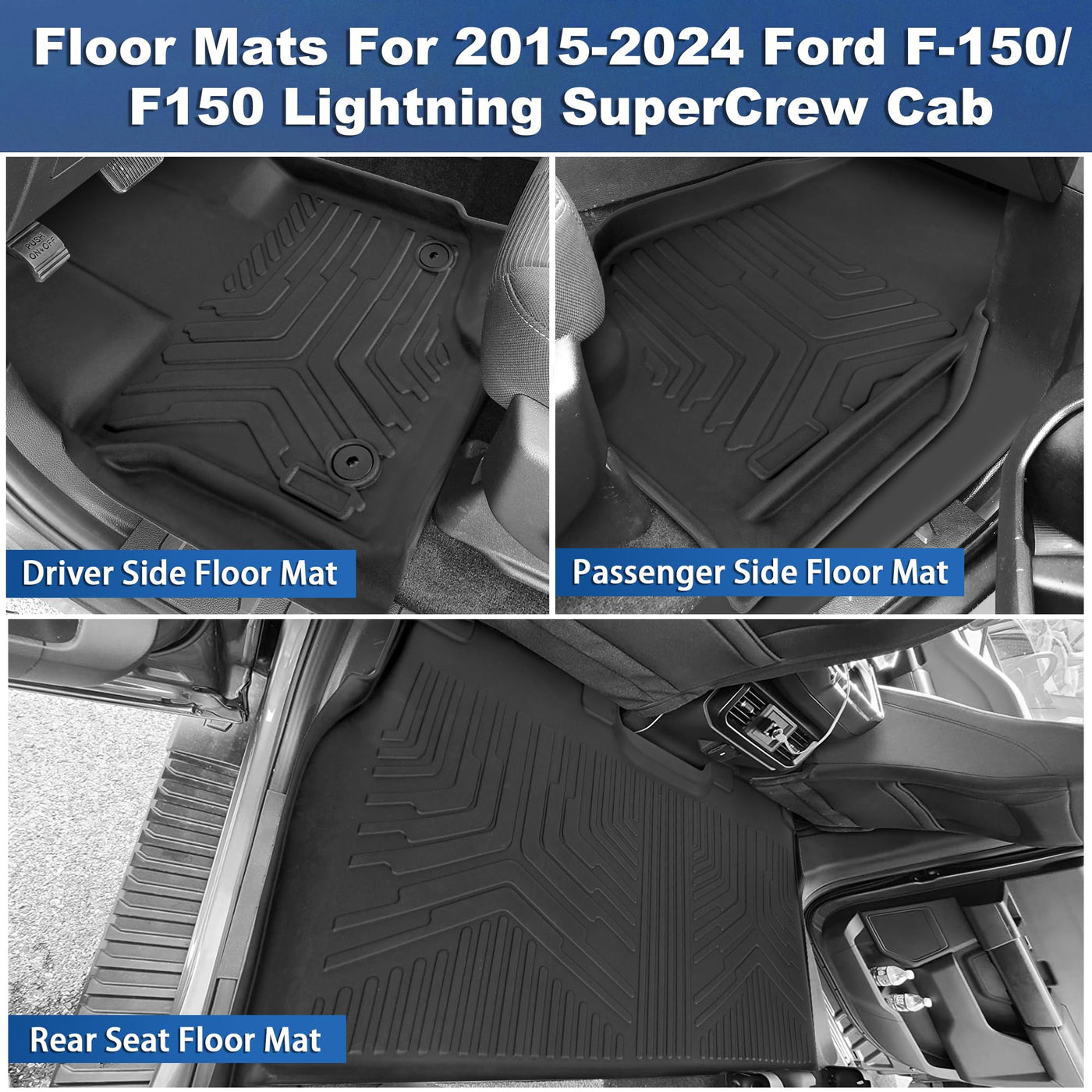 ?CUSTOM FITMENT?:Compatible with Ford F150 SuperCrew Cab 2015-2024 2025 . Only fits SuperCrew cab with first row bucket seats (4 full size doors).(NOT for Bench Seat model).We used the advanced 3D real vehicle scanning technology to capture every corner and contour to design the custom Cargo Liners that fit the Ford F150. | ?Durable & Safe Material?: Made of Premium Quality Thermoplastic Elastomer compound TPE, providing 100% odorless, BPA Free, Non-Toxic, and eco-friendly coverage in all weather conditions, and you can safely leave your pet in the car. | ?Full Coverage Protection?: With our custom-fit design, you'll enjoy a seamless fit that hugs every contour of your cargo area. This ensures maximum coverage and prevents any shifting or sliding, giving you peace of mind during your travels, and offering maximum protection from spills, stains, dirt, mud, snow and etc. Designed to work with factory retention posts, the mats lock into place and stay non-slip. | ?Easy Clean Maintenance?:Easy to clean and keep looking new.Extremely easy to clean with a water hose or towel.Constructed from superior quality materials, these mats will preserve the original look of your vehicle for years to come, with a snug fit and unbeatable durability.Textured skid-resistant surface helps keep your feet stable and secure, while their easy-to-clean design makes maintenance simple. | ?AFTER-SALES SERVICE? : Package Size:35.83*22.05*6.69inch. If there is any problem with the product, please feel free to let us know. We will solve the problem for you.
