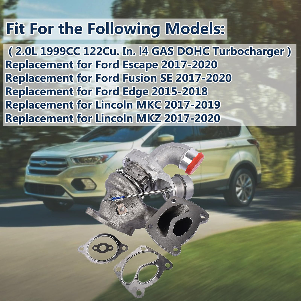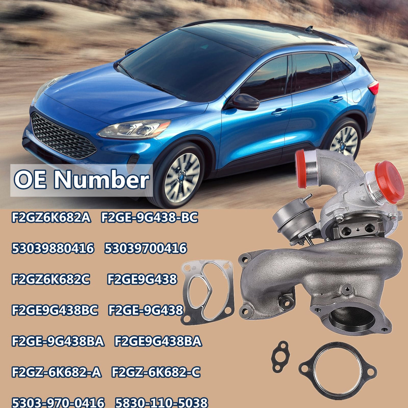 OEM Part Number 53039880416, 53039700416F2GZ6K682C, F2GE9G438, F2GZ6K682AF2GE-9G438-BC, F2GE9G438BC, F2GE-9G438F2GE-9G438BA,F2GE9G438BA, F2GZ-6K682-AF2GZ-6K682-C, 5303-970-0416, 5830-110-5038 Fit For the Following Models Compatible with For-d Es-cape 2.0L 1999CC 122Cu. In. l4 GAS DOHC Turbocharger 2017-2020Compatible with For-d Fu-sion SE 2.0L 1999CC 122Cu. In. l4 GAS DOHC Turbocharger 2017-2020Compatible with For-d Ed-ge 2.0L 1999CC 122Cu. In. l4 GAS DOHC Turbocharger 2015-2018Compatible with Lin-coln MKC 2.0L 1999CC 122Cu. In. l4 GAS DOHC Turbocharger 2017-2019Compatible with Lin-coln MKZ 2.0L 1999CC 122Cu. In. l4 GAS DOHC Turbocharger 2017-2020