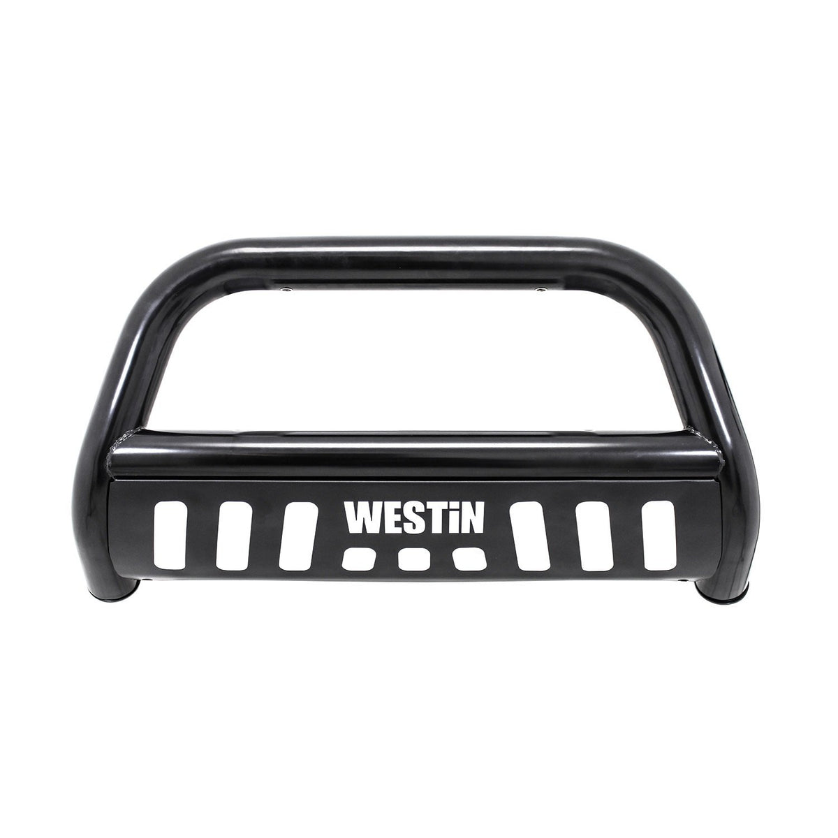 Westin's E-Series Bull Bar is a front-end light bar designed for trucks and larger model SUVs. It mounts to the vehicle's existing mounting points with no drilling required and comes complete with vehicle specific mount kit. It also features mounting points for 2 auxiliary lights up to 6 inches in diameter. The E-Series Bull Bar features a laser cut Westin block letter logo design on the skid plate. Optional license plate bracket is available.
