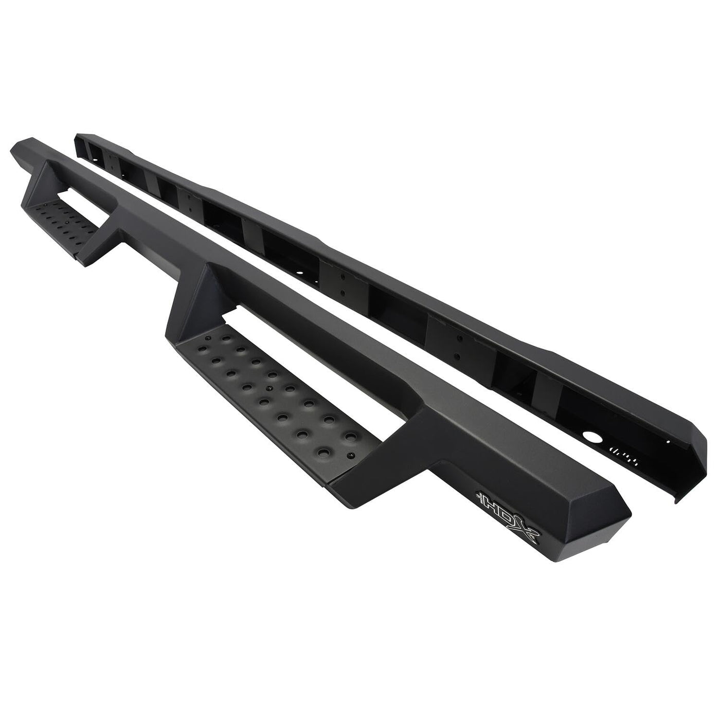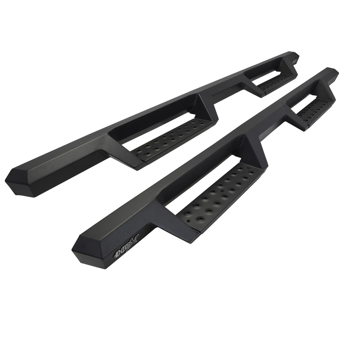 Westin's HDX Drop Nerf Bars, awarded 'Best New Exterior Accessory Product' by SEMA, are a great automotive off-road accessory for truck enthusiasts looking for a mix of heavy duty ruggedness and style. Constructed from sturdy one-piece stainless or mild steel, these bars are made to last.They feature removable steel step plates that offer 2 inches of extended toe/heel space, surpassing rivals. The bars' textured black finish, corrosion-resistant coating, and die-stamped stainless steel step areas not only improve the vehicle's look but also its functionality.Mild steel HDX Drop Nerf Bars are finished with a textured black coating and stainless steel are black powder-coated. Both fit snugly against the rocker panels, providing a secure fit and a rugged appearance while protecting your truck.Included with the bars is a specific-fit mounting kit with all necessary hardware and instructions, facilitating an easy, drill-free installation for most models. You can select from cab length or wheel-to-wheel styles, easily bolting them on to enhance both the look and functionality of your truck.