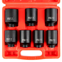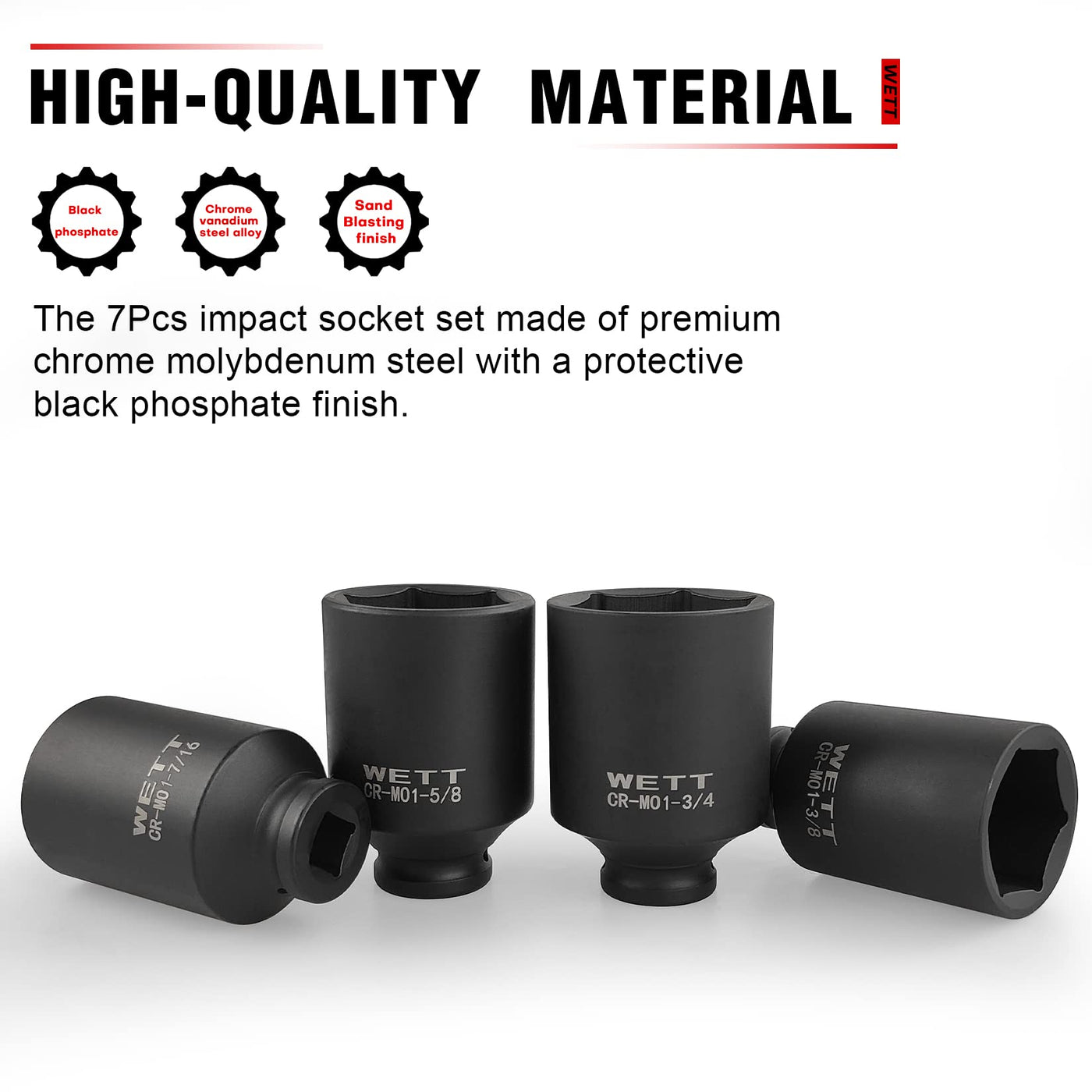?Package Include?The 7 Pcs Axle Nut Impact Socket Set include:1-11/16',1-9/16',1-3/8',1-7/16',1-1/2', 1-5/8', 1-3/4' .Extra-deep broach accommodates longer fasteners, Engineered for use with impact drivers. ?Material?The 7 Pcs impact socket set made of premium chrome molybdenum steel with a protective black phosphate finish. ?6-Point?High-torque, 6-point opening grips flat sides of fasteners, not corners, preventing round-off. ?Size Clearly?Permanently Laser Etched And Easy To Read, Even In Low Light. ?Easy to carry?The socket set can easy to transport,safe storage and quick organization.