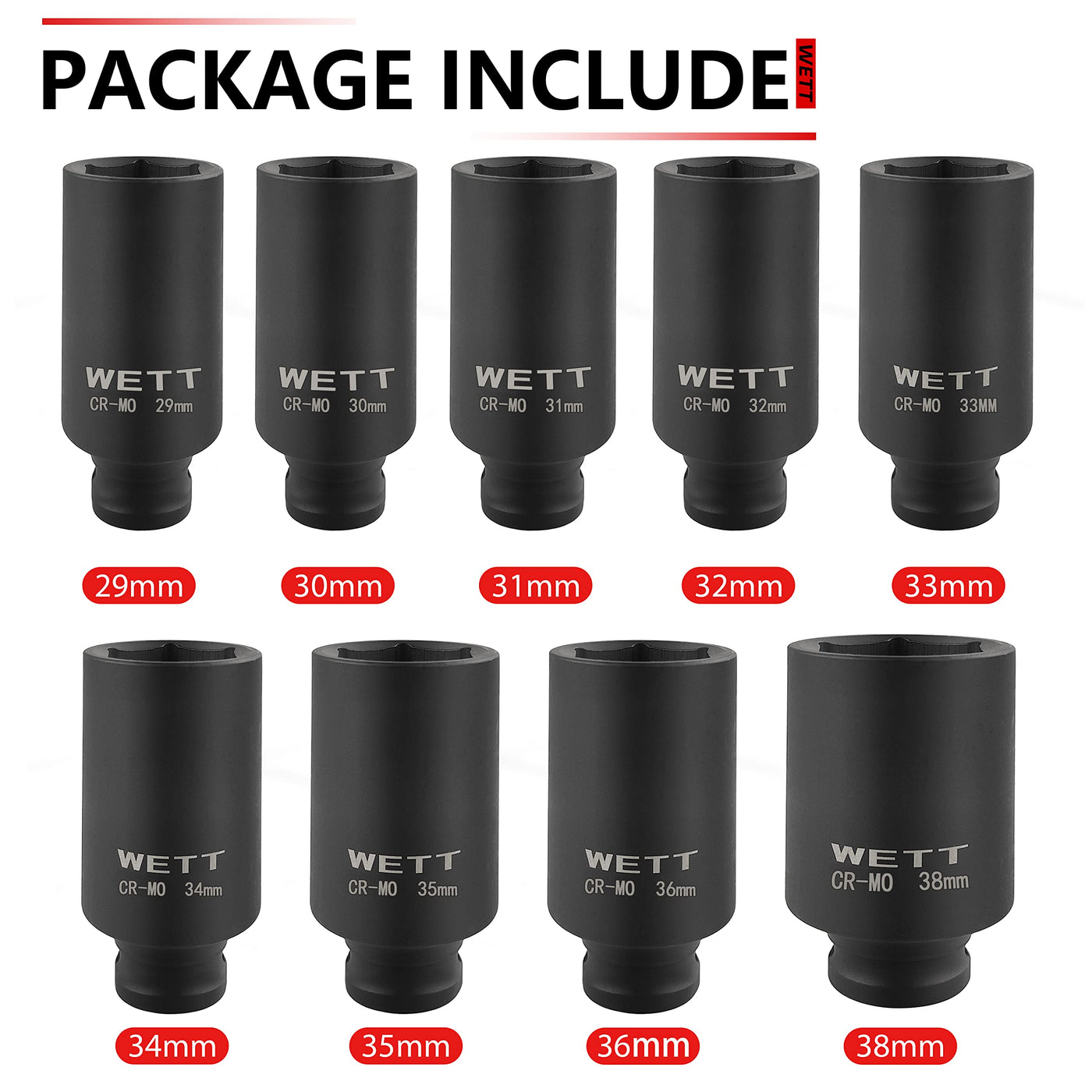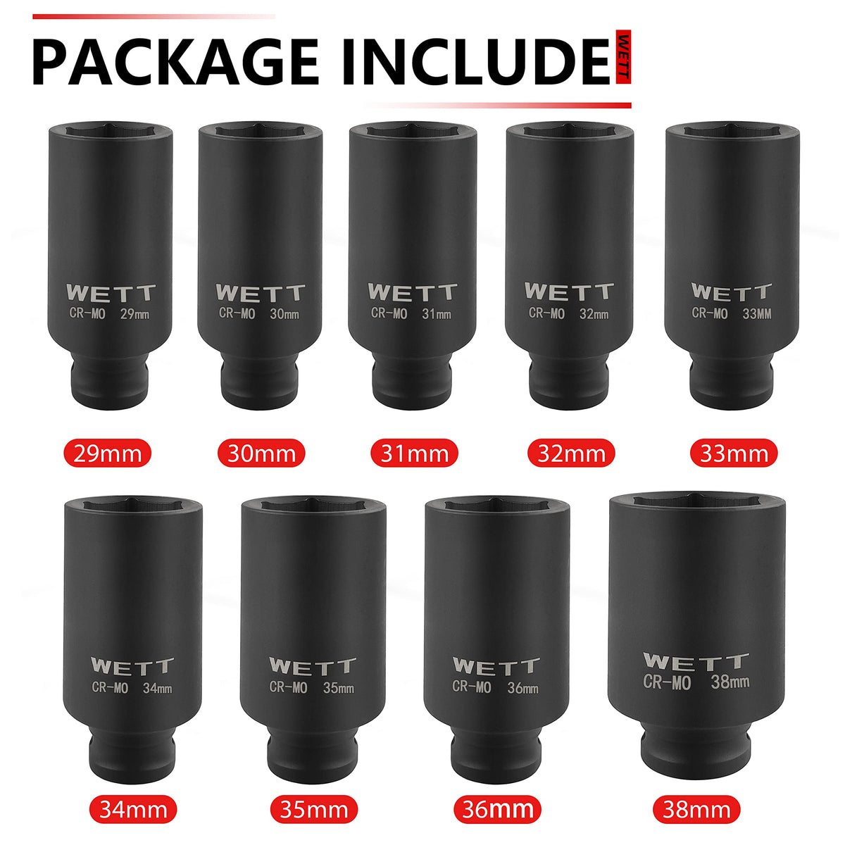 Q: What sizes are included in the WETT 9Pcs Impact Socket Set?A: The WETT 9Pcs Impact Socket Set includes sizes 29mm, 30mm, 31mm, 32mm, 33mm, 34mm, 35mm, 36mm, and 38mm, making it versatile for various automotive and mechanical applications.
