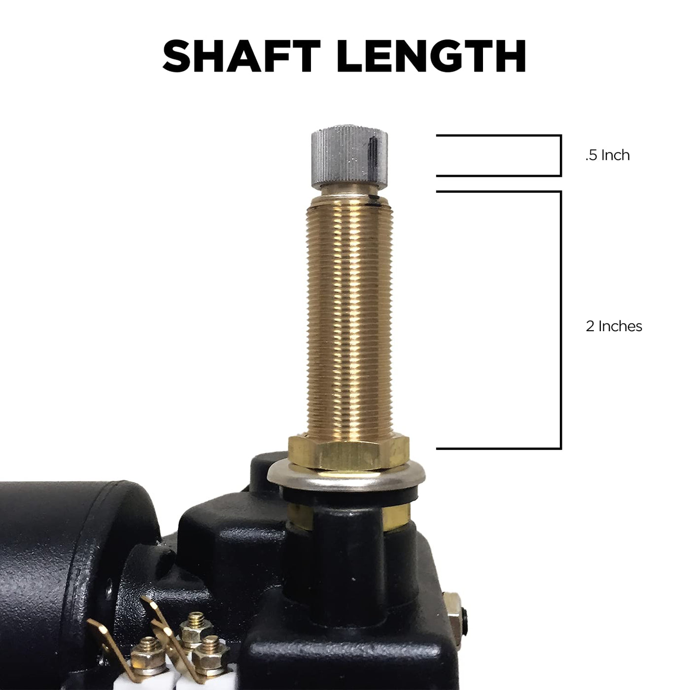 Q: What is the shaft size of the Wexco Wiper Motor?A: The shaft size is two and a half inches. This includes two inches of thread and half an inch of drum.
