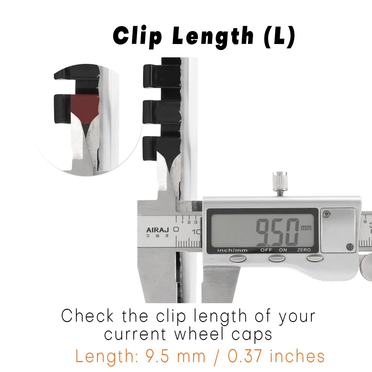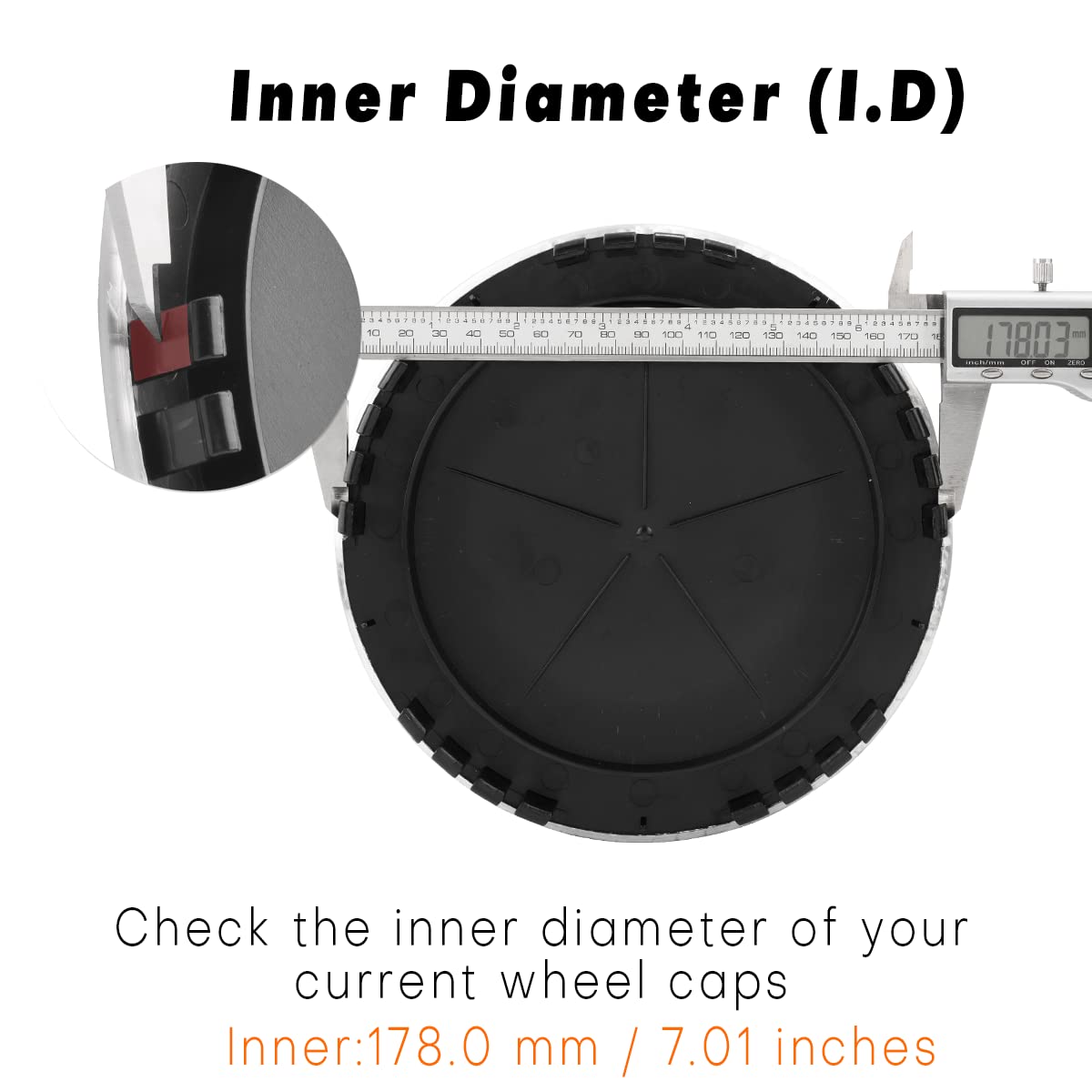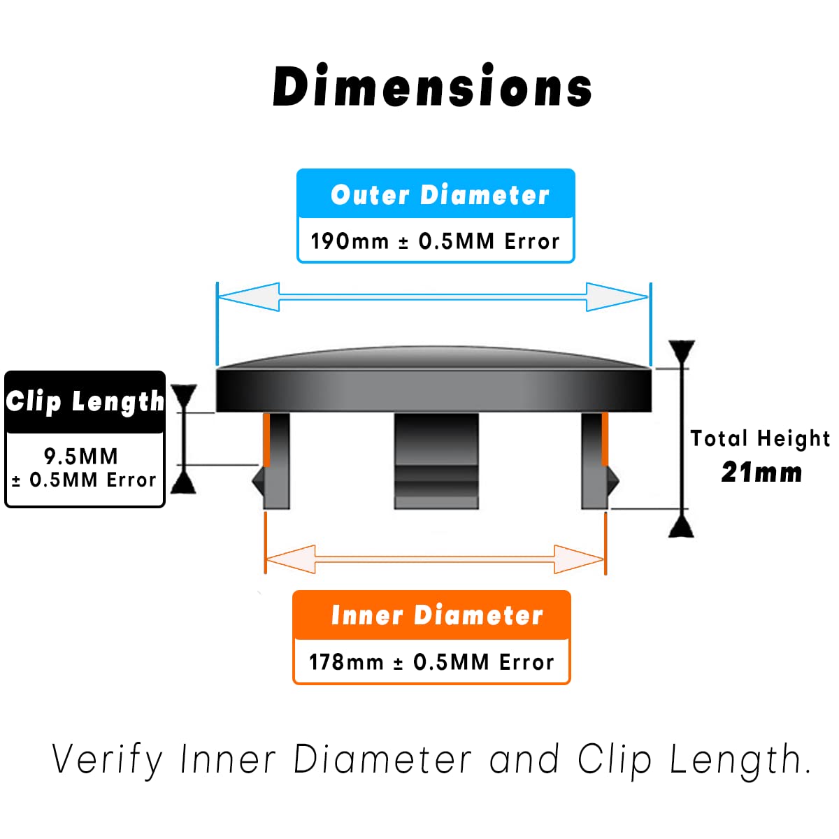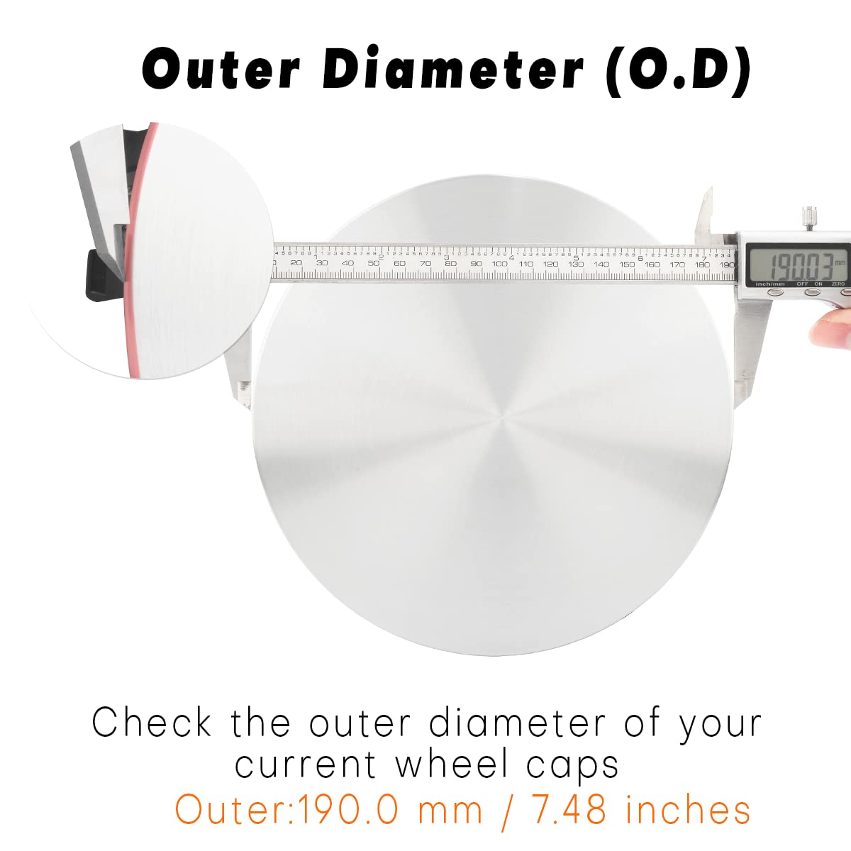 Q: What are the dimensions of the wheel center caps?A: The outer diameter of the wheel center caps is approximately 190mm (7 31/64 inches), the inner diameter is about 178mm (7 inches), and the clip diameter is 19mm (approximately 3/4 inch).