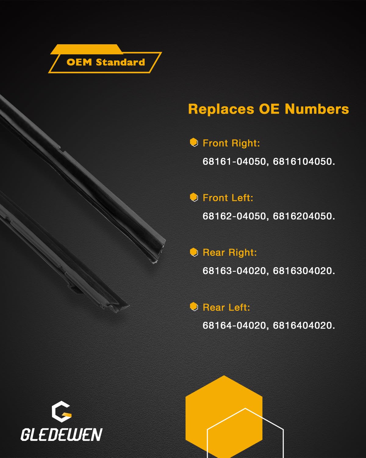 Packing List:1 x Front Left Driver Black Window Weatherstrip Trim Seal Belt1 x Front Right Passenger Black Window Weatherstrip Trim Seal Belt1 x Rear Left Passenger Black Window Weatherstrip Trim Seal Belt1 x Rear Right Passenger Black Window Weatherstrip Trim Seal BeltCondition: NewCompatible with:2005-2015 Toyota Tacoma Double CabPrecise Fit Part Numbers:Front Right: 68161-04050, 6816104050Front Left: 68162-04050, 6816204050Rear Right: 68163-04020, 6816304020Rear Left: 68164-04020, 6816404020Function: With the passage of time, the molding overlay trim kit will gradually be worn and then broken. At this time, harmful water and debris will enter the door window. It is recommended that you replace auto window seal in time. Replacing a new window seal strip can prevent the occurrence of water accumulation, and provide you with long-term stability and excellent performance. These automotive exterior accessories meet or exceed the oem standard, and have been well-tested in the factory, perfectly matching the original car, and can be installed directly.We are a factory direct saler. Customers can spend a small amount of money and get high quality brand new window seal belt. This car door window seal strip replacement provides excellent value at the cheapest price.Own it now.