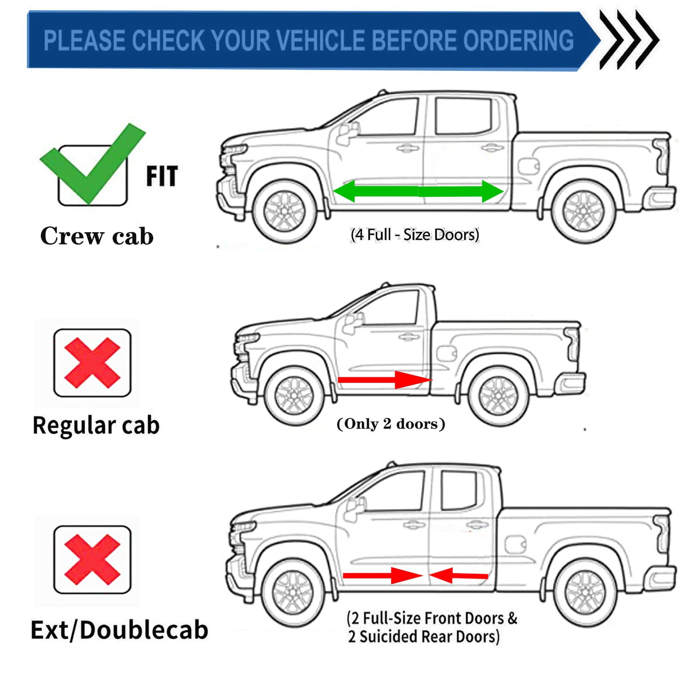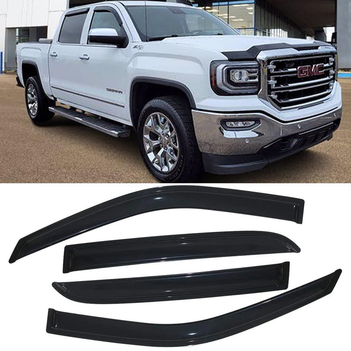 Car Window Rain Guards Fitment2014-2018 Silverado 1500 Crew cab2015-2018 Silverado 2500HD/3500HD Crew cab2014-2018 Sierra 1500 Crew cab2015-2018 Sierra 2500HD/3500HD Crew cabNote: Please check the display picture to see the cab difference and make sure your truck is the correct cab that this item will fit !!!Item-Offered4pcs vent guards shade window visors StyleOutside Mount Style, Easy Peel-N-Stick Installation. No Cutting or Drilling Required (Stick on to the door & above the windows.Not In-Channel Style)Position4pcs For Front & Rear (Driver & Passenger) VisorsMaterialReinforced AcrylicColorSmokeFeatures1. This item is all new package upgrade products, Never used or installed.2. Comes With 3M Automotive-Grade Double-Sided Tapes.3. Fully window protected from sun shade, wind, rain, snow deflector.4. Helps to reduce heat build-up in parked vehicles by allowing windows to be partially open.5. High quality and durable plastic to withstand the rigors of the elements.6. Make it possible to leave the windows down a few inches to get fresh air even on rainy days.7. Dramatically improve your vehicel appearance.Car Window Rain Deflectors window guards car window deflectors rain guards window visor auto window deflectors vent visor car window rain guard window rain guards for cars rain guards for car rain guard window rain visor for car window auto window deflectors for wind deflectors for cars rain gards for car windows window guards for cars rain deflectors for car windows vent shades for car windows rain guard for car windows window deflectors for vehicles car window visor vent visors for cars window vents