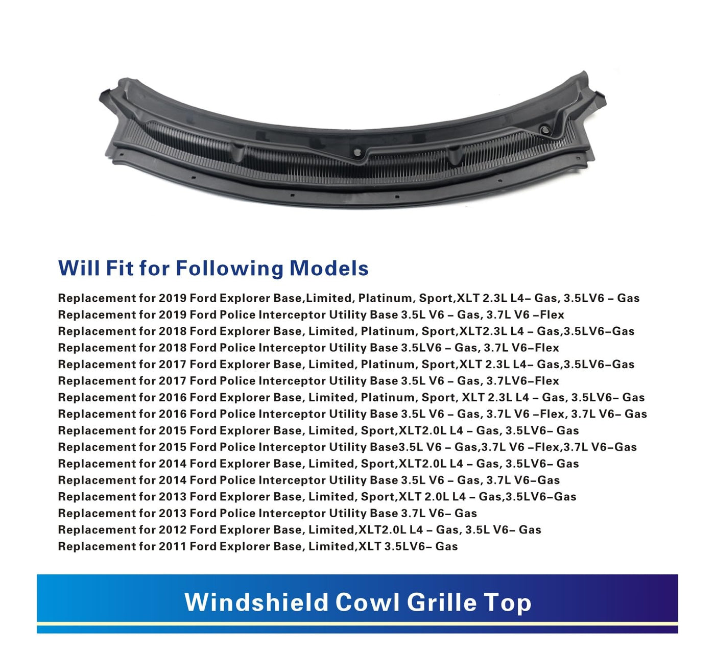 *Fitment: For Ford Explorer Base, Limited, Platinum, Sport, XLT 2.3L L4 - Gas, 3.5L V6 - Gas 2019 For Ford Explorer Base, Limited, Platinum, Sport, XLT 2.3L L4 - Gas, 3.5L V6 - Gas 2018 For Ford Explorer Base, Limited, Platinum, Sport, XLT 2.3L L4 - Gas, 3.5L V6 - Gas 2017 For Ford Explorer Base, Limited, Platinum, Sport, XLT 2.3L L4 - Gas, 3.5L V6 - Gas 2016 For Ford Explorer Base, Limited, Sport, XLT 2.0L L4 - Gas, 3.5L V6 - Gas 2015 For Ford Explorer Base, Limited, Sport, XLT 2.0L L4 - Gas, 3.5L V6 - Gas 2014 For Ford Explorer Base, Limited, Sport, XLT 2.0L L4 - Gas, 3.5L V6 - Gas 2013 For Ford Explorer Base, Limited, XLT 2.0L L4 - Gas, 3.5L V6 - Gas 2012 For Ford Explorer Base, Limited, XLT 3.5L V6 - Gas 2011 OE: BB5Z78022A68AA *Package Included: 1Pc Top Windshield Cowl Grille *Features: 100% Brand New, OEM Fitment and Quality at Decent Price! Comes As 1 Separated Pieces Made of Durable & Light-Weight Plastic Material Bring a More aggressive Front End to Your Car Immediately Protect Bumper From Scratching & Improve Sporty Appearance All at Once *Installing Template is NOT Included, Professional Installation Is Highly Recommended*