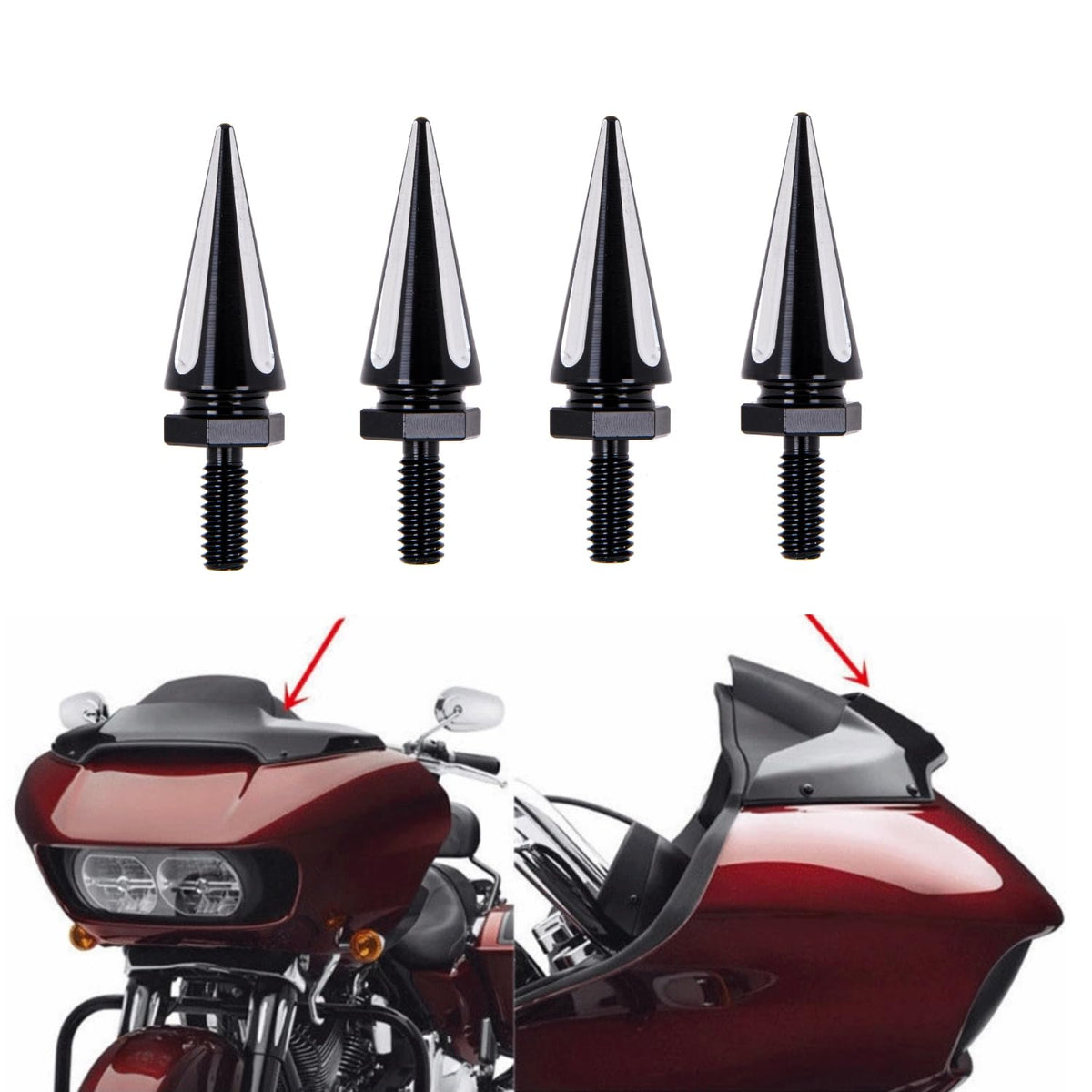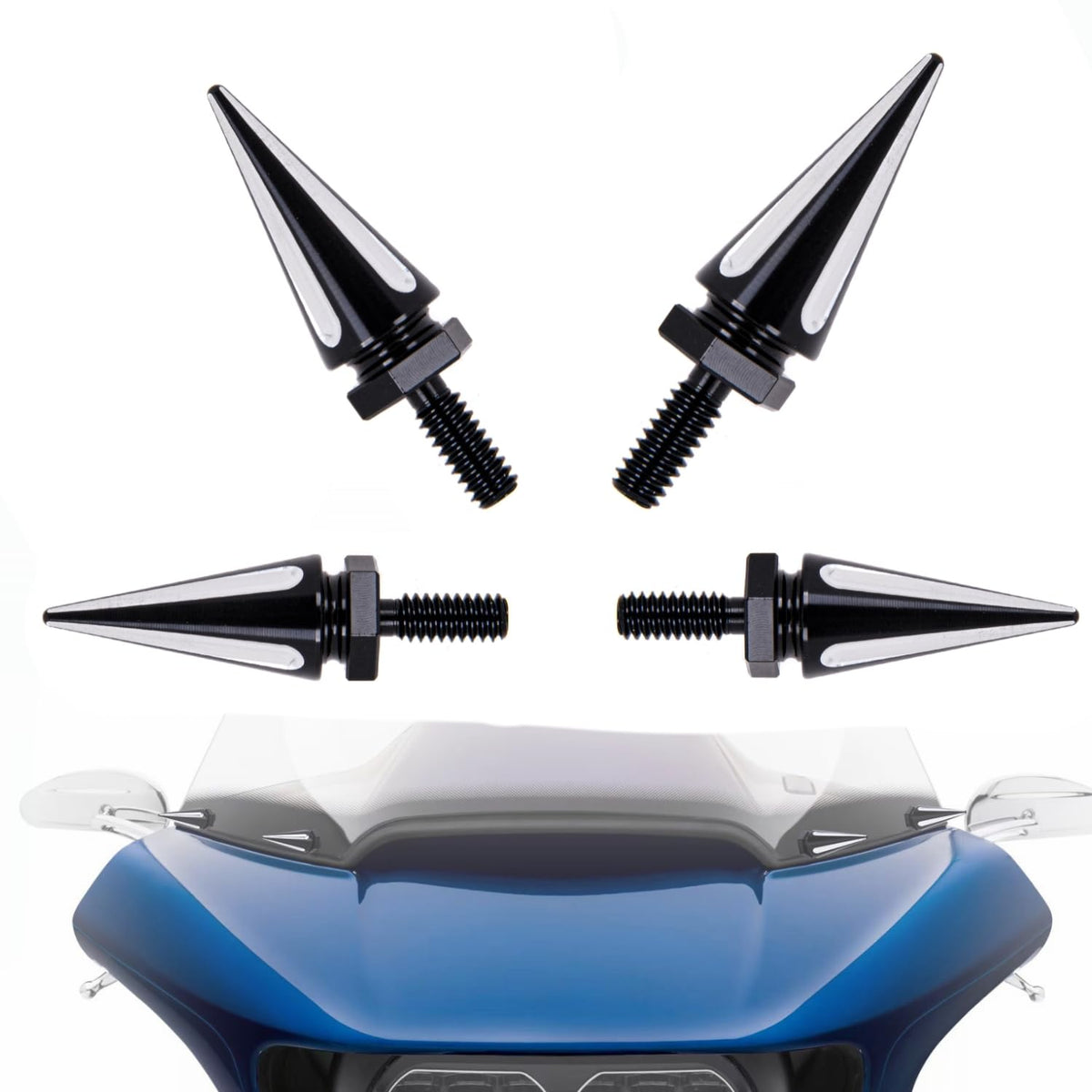 Fitment: 2014-Up Street Glide/ Street Glide Specials 2014-Up Electra Glide/ Ultra 2014-Up Freewheeler/ Tri Glide Brings Billet Style To The Windscreen Trim Installs In Minutes, Direct Replacement On Factory Bolts Cnc Machined From Forged Billet Aluminum Black Anodize Finish With Aluminum Accents 1.65 Inch Long Spike Bolts Sold As A Set Of Three