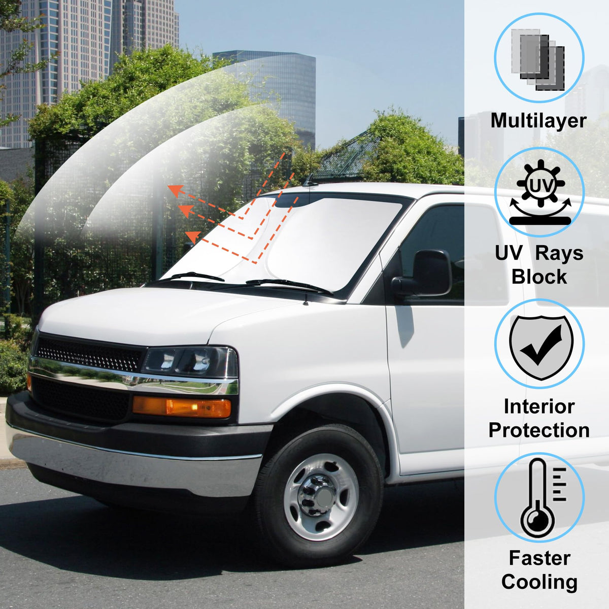Windshield Sun Shade Compatible With 1996-2024 2025 Chevrolet Express Cargo Van 1500, 3500, 4500, Ls, Lt Winter Accessories Fold