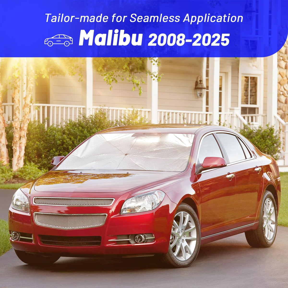 Windshield Sun Shade Umbrella for Chevrolet Malibu 2008-2025 Foldable Car Sunshade for Front Windows with 360 Rotating Shaft, Cu