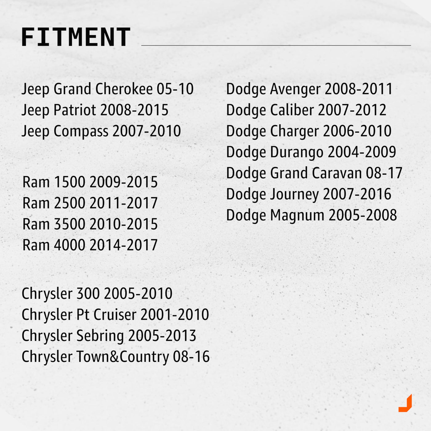 2 pcs Front Windshield Washer Nozzles, Washer Spray Jet Kit Replacement for: Chrysler, Dodge, Jeeep Replaces OEM #: 4805742AB / 5113049AA / 55077460AA / 5303833AA / 5116079AA Replacement for the following vehicles: - Replacement for 2005-2010 Jeep Grand Cherokee, - Replacement for 2008-2015 Jeep Patriot, - 2007-2010 Jeeep Compass Replacement for Chrysler & Dodge models: - 2005-2010 Chrysler 300, - 2001-2010 Chrysler Pt Cruiser, - 2005-2013 Chrysler Sebring, - 2008-2016 Chrysler Town & Country, - 2007-2012 Dodge Caliber, - 2005-2008 Dodge Magnum, - 2006-2010 Dodge Charger, - 2009-2015 Dodge Ram 1500, - 2011-2017 Dodge Ram 2500, - 2010-2015 Dodge Ram 2500 C/V, - 2010-2015 Dodge Ram 3500, - 2014-2017 Dodge Ram 4000, - 2008-2011 Dodge Avenger, - 2007-2016 Dodge Journey, - 2004-2009 Dodge Durango, - 2008-2017 Dodge Grand Caravan TIP! Each car model can be equipped with several different types of spray nozzles, depending on the configuration, which might differ in their fitting size and shape! We recommend removing the original nozzles and comparing them with the image and dimensions of this product before placing an order! Windshield Washer Spray Nozzles are essential components of your vehicle's windshield washer system. Designed to evenly distribute washer fluid onto the front windshield, these nozzles ensure clear visibility and optimal cleaning performance. Crafted from durable materials, the Front Windshield Washer Spray Nozzles are built to withstand various weather conditions and the test of time. They are precision-engineered to deliver a fine and consistent spray pattern, effectively removing dirt, grime, and other debris from your windshield. Easy to install, these spray nozzles are designed to fit seamlessly into the front windshield washer system of your vehicle. With their adjustable design, you can customize the spray direction and angle to suit your preferences, ensuring maximum coverage and efficiency. Regularly maintaining and replacing your Front Windshield Washer Spray Nozzles is crucial for the proper functioning of your windshield washer system. By ensuring a clear and unobstructed spray, you can enhance your driving safety and visibility, especially during adverse weather conditions. Upgrade your vehicle's windshield washer system with high-quality Front Windshield Washer Spray Nozzles. Experience improved cleaning performance, enhanced visibility, and a safer driving experience. Specification:This is Not Genuine Auto Part. This is Aftermarket Part Manufactured by ClicknFit, Exceeds the Original Design, and Carries a 12 Month Warranty