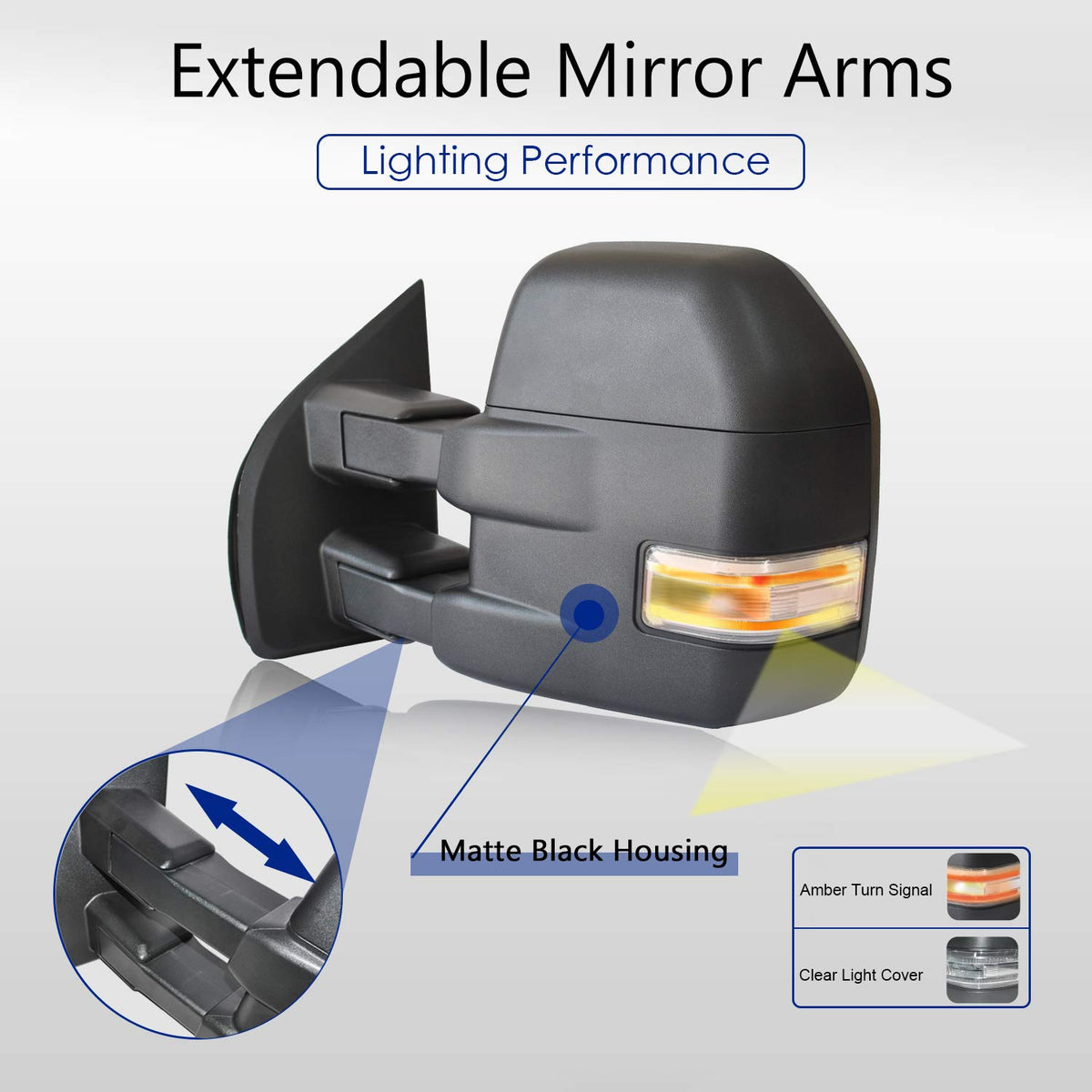 What'S Included: A Pair Of Towing Mirrors ( Driver Left Side + Passenger Right Side ) , Great Customer Service. Vehicle Fits: 2015 2016 2017 2018 2019 Ford F150 Pickup Truck Product Information: Power Heated Turn Signal Light&Nbsp; Manual Extendable Arms Black Housing Details: Top Quality Reflective Glass Ensures Less Distortion. The Bracket And The Shell Are Formed By Plastic Injection Molding To Prevent Vibration While Driving. Increasing The Visibility Of The Blind Spot And Expanding The Angle In Daily Or Dragging Activities, It Looks Safer. Easy Installation, No Drilling Or Cutting Required. Important: These Mirrors Will Only Work Properly On Vehicles With These Exact Options. If Your Vehicle Does Not Have The Options Listed, These Mirrors May Not Function Properly! (Does Not Fit 22 Pin). Any Problem, We Will Provide A Perfect Solution , Thanks!