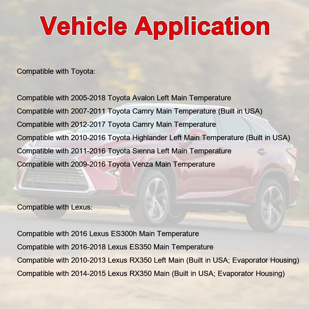 WMPHE A/C HVAC Air Door Actuator Heater Blend Number of terminals:5 pin Type:temperature blend actuator Material:ABS plastic OEM Part Number Replacement for 604-906 Replacement for 8710607120 Vehicle Application Compatible with Toyota: Compatible with 2005-2018 Toyota Avalon Left Main Temperature Compatible with 2007-2011 Toyota Camry Main Temperature (Built in USA) Compatible with 2012-2017 Toyota Camry Main Temperature Compatible with 2010-2016 Toyota Highlander Left Main Temperature (Built in USA) Compatible with 2011-2016 Toyota Sienna Left Main Temperature Compatible with 2009-2016 Toyota Venza Main Temperature Compatible with Lexus: Compatible with 2016 Lexus ES300h Main Temperature Compatible with 2016-2018 Lexus ES350 Main Temperature Compatible with 2010-2013 Lexus RX350 Left Main (Built in USA; Evaporator Housing) Compatible with 2014-2015 Lexus RX350 Main (Built in USA; Evaporator Housing)