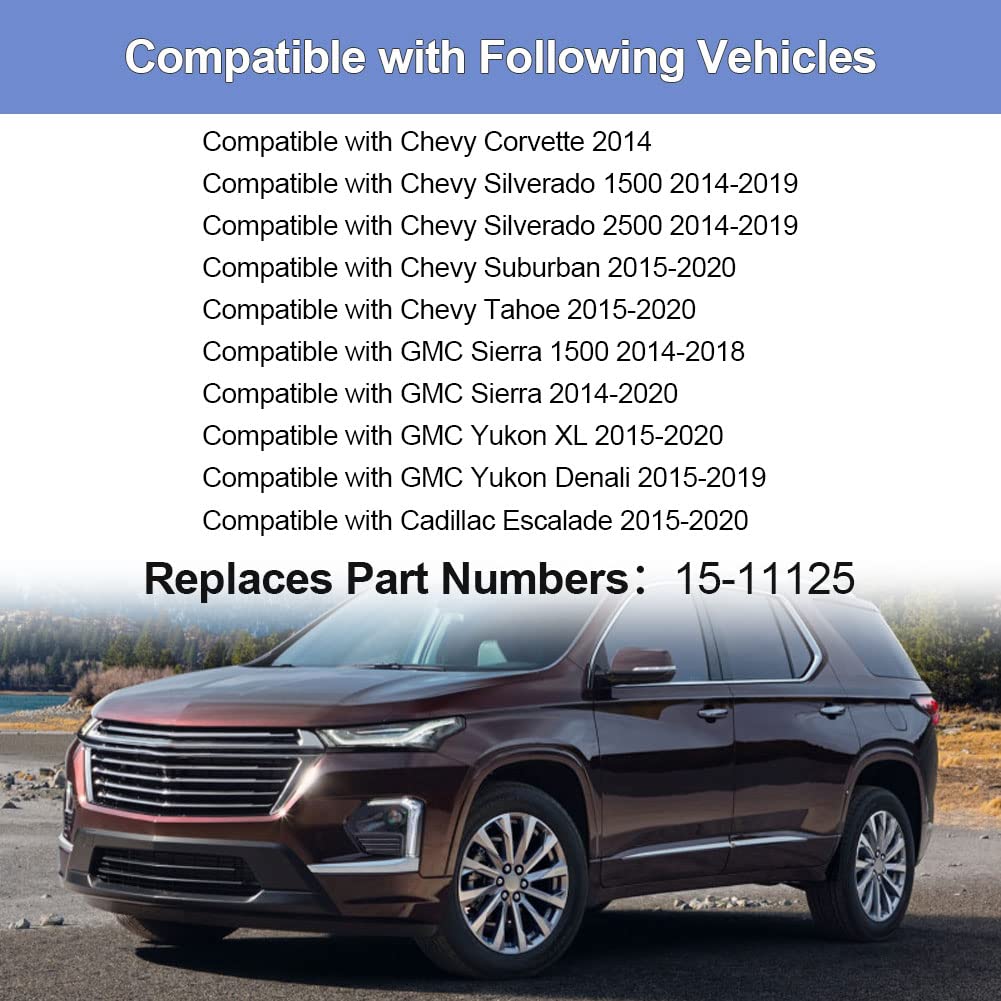 Compatible with Chevy Compatible with Chevy Corvette 2014 Compatible with Chevy Silverado 1500 2014-2019 Compatible with Chevy Silverado 2500 2014-2019 Compatible with Chevy Suburban 2015-2020 Compatible with Chevy Tahoe 2015-2020 Compatible with GMC Compatible with GMC Sierra 1500 2014-2018 Compatible with GMC Sierra 2014-2020 Compatible with GMC Yukon XL 2015-2020 Compatible with GMC Yukon Denali 2015-2019 Compatible with Cadillac Compatible with Cadillac Escalade 2015-2020