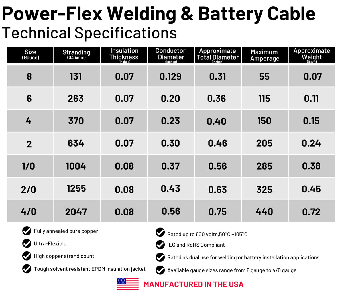 WindyNation's Power-Flex Welding and Battery Cable is an ultra-flexible industrial grade cable that is manufactured in the USA to the highest quality standards. Power-Flex Cable is ideal for welding applications, battery wiring applications, off-grid wind and solar systems, RV & car (audio/stereo) wiring, inverter to battery wiring, and any application that requires an ultra-flexible pure copper conductor. Refer to the photo gallery for a detailed specification chart for each gauge size. Available gauge sizes range from 8 gauge to 4/0 gauge.