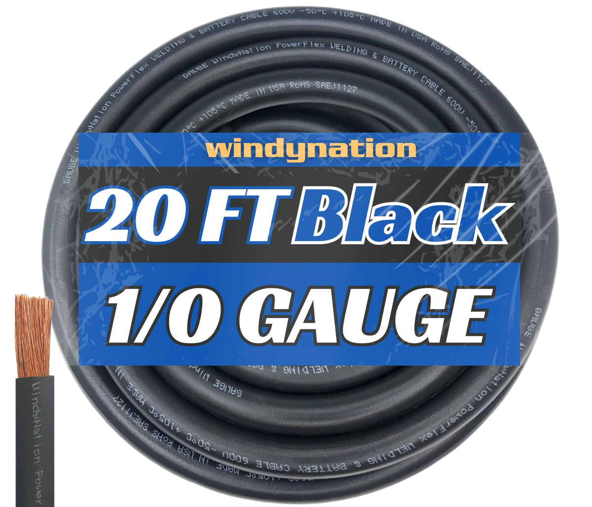 WNI 1/0 Gauge 20 Feet Black 1/0 AWG Ultra Flexible Welding Battery Copper Cable Wire - Made In The USA - Car, Inverter, RV, Solar