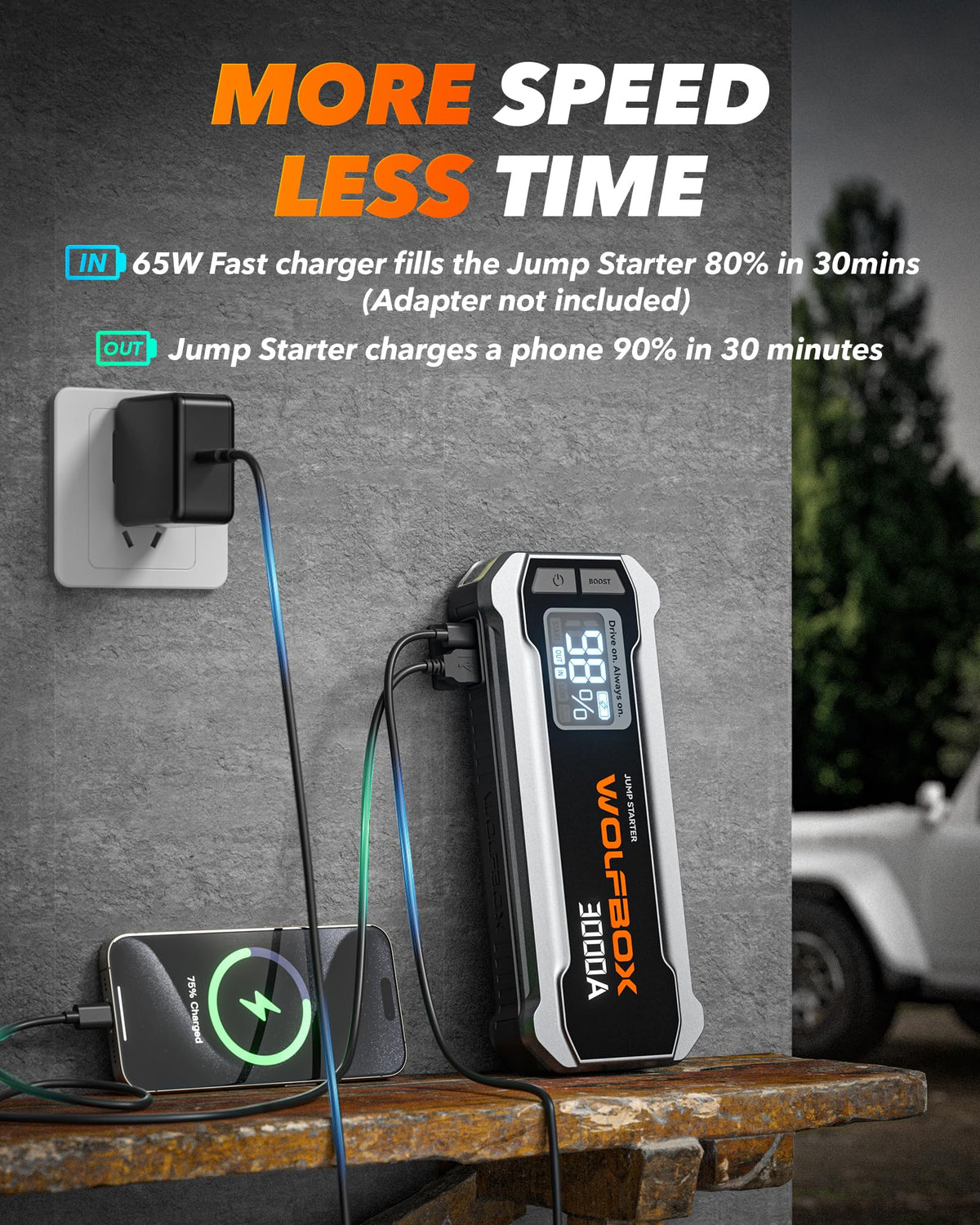 Elevate Your Drive With Wolfbox Forhigh-Tech, Rugged, Stylish Road Safety.High-Capacity 3000A Jump Starter - This Car Battery Jump Starter With A Robust 16000Mah Battery, It Is Ideal For 12V Vehicles, Including Cars, Trucks, Boats, And Larger Vehicles. It Can Quickly Revive Dead Batteries In Emergencies, Whether You Have A Gasoline Car Under 10L Or A Diesel Vehicle At Home.65W Usb-C Quick Charging - We Have 1 * 65W Type-C In/Out Port,1 * Qc3.0 Usb-A Port, The Jump Start Battery Pack Source Fully Charges In Just One Hour. With Two Output Ports, It Quickly Charges Common Electronic Devices Like Phones, Laptops, Ipads, Making It Ideal For Travel Or Campingbooster & Led Flashlight - The Booster Function Can Assist You In Starting Your Vehicle Normally When The Voltage Is Too Low, And This Jump Box Supply Also Comes Equipped With An Led Flashlight Featuring Sos, Strobe, And High-Beam Modes.In Emergency Situations, It Can Serve As Your Emergency Devicehd Led Display - This Led Screen Provides A Clear Display Of All The Status Indicators For The Portable Car Jump Starter Supply. You Can Easily Discern The Current State Of Your Emergency Power Source, Facilitating Seamless Access To All Functionalitiesip64 & 10 Types Protections - The Battery Jumper Starter Portable With An Ip64 Protection Rating, Ensures The Emergency Power Supply Is Resilient In Harsh Environments.Internally, It Features 10 Essential Safety Protections,Including Spark-Proof, Low-Temperature Protection, And High-Temperature Protection24 Months Warranty & Customer Services - The Battery Jumper Starter Portable Comes With A 24-Month Warranty, Software Upgrades, And 24/7 Customer Service. During This Period, We Will Resolve Any Issues Related To The Product, Installation, Or Usage For You.