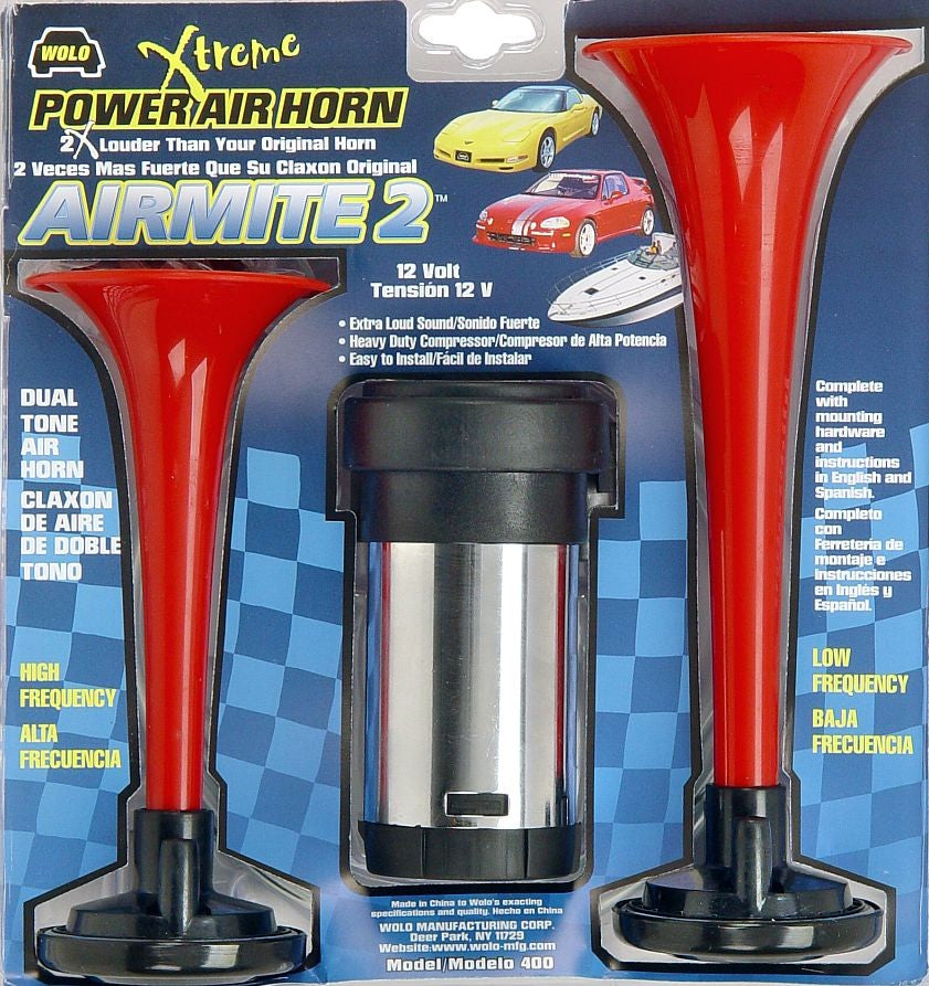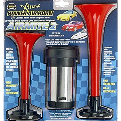 Air-powered and very loud (118 decibels), the Airmite 2 Horn is perfect for all 12-volt vehicles. The kit features two durable red plastic trumpets and a maintenance-free chrome-plated compressor. Your purchase comes complete with an English/Spanish instruction manual and all mounting hardware for easy installation in any vehicle.