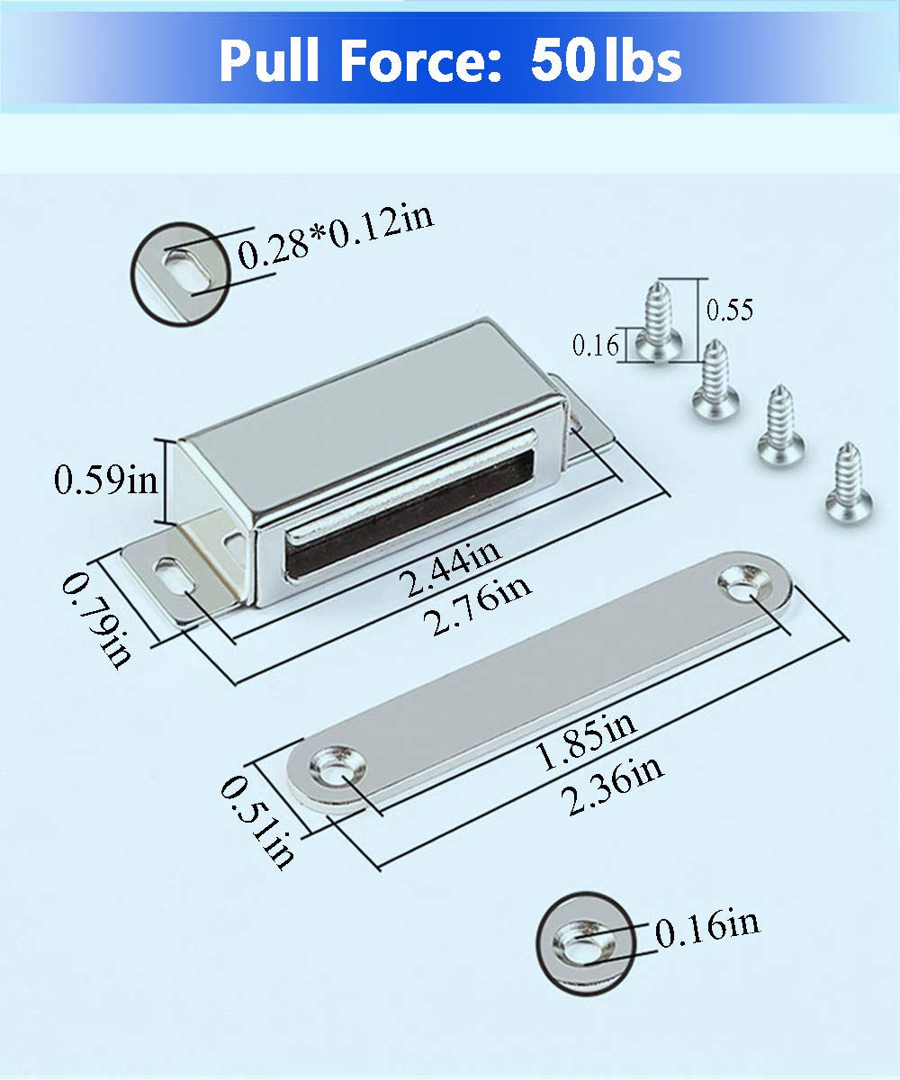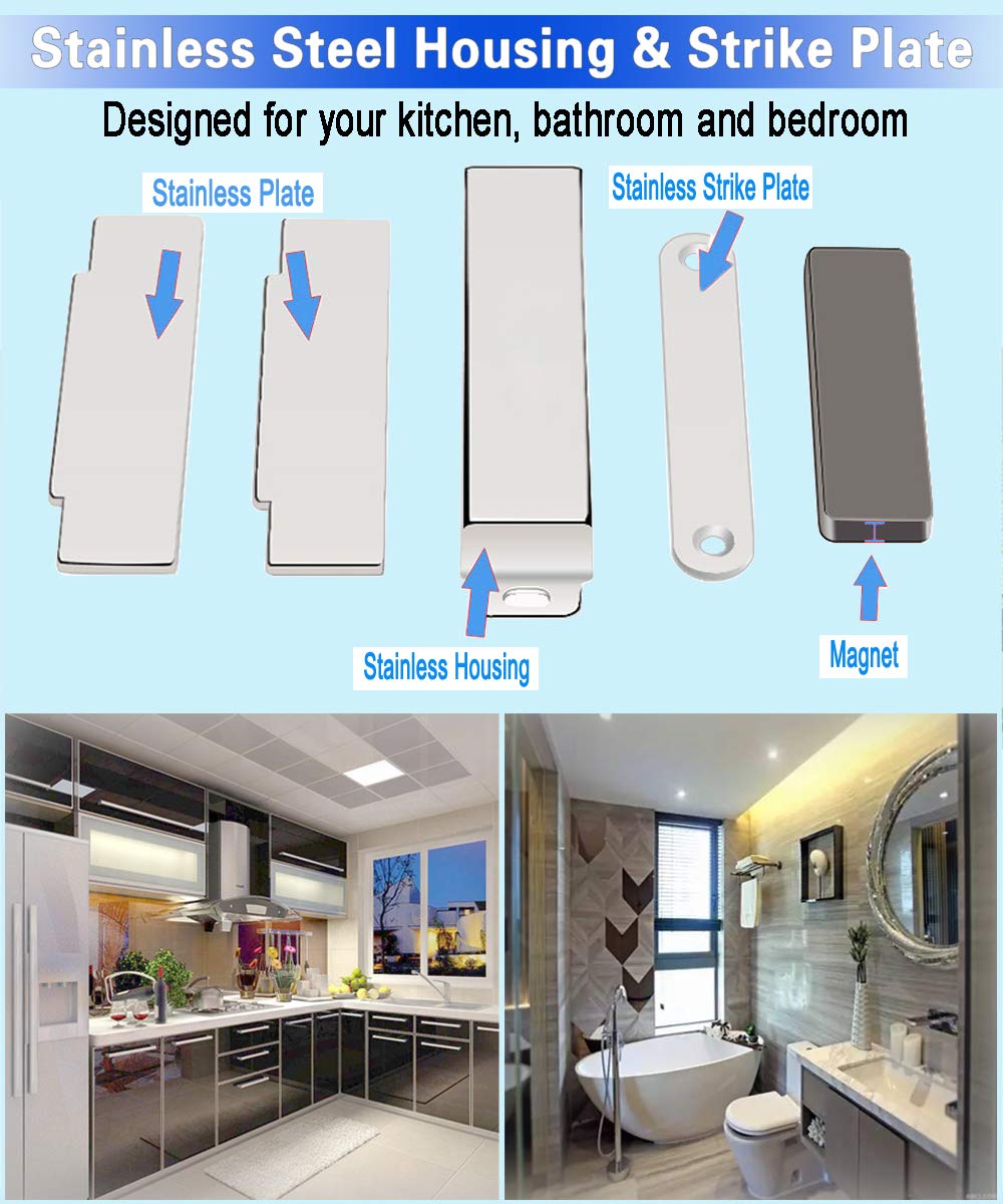 304 stainless steel housings for excellent corrosion resistance. Nickel-plated magnets hold doors securely closed. Strike plates are 1.2mm thick and can be recessed to reduce the gap between cabinet and door. Ideal for institutional and coercial applications. Keep your cabinets safe and secure by choosing WOOCH top quality cabinet magnets. .