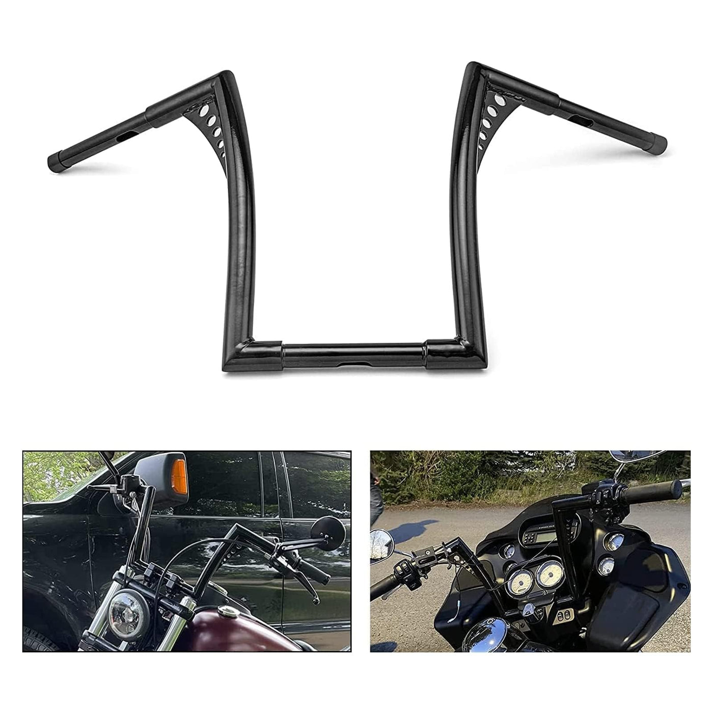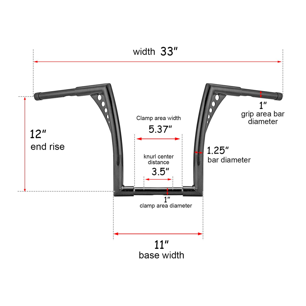Specifications: Bar Diameter: 1-1/4 inch Center Width: 10-1/2 inch, Clamp Area Width: 5.37 inch & Diameter: 1 inch Grip Area Bar Diameter: 1 inch Pre-Drilled: Yes End Rise: 12'' Finish: Power Coat Gloss Black Material: Steel pipe (Much Stronger than other's Straight Seam Welded pipe handlebar on the market) Model: Monkey Bagger Bar Overall Width: 33 inch Pullback/Sweep: 8 inch< /br> Fitment List: Fit most Harley Dyna Softail Sportster XL 883 1200 1994-2022 Road King Model 1998-2013 &Road Glide 1994-2013. **Do not fit Harley Electra Glide,Street Glide & 2014-UP Road Glide** **Do not fit 2008-2011 Harley Cross Bones FLSTSB with OEM risers**