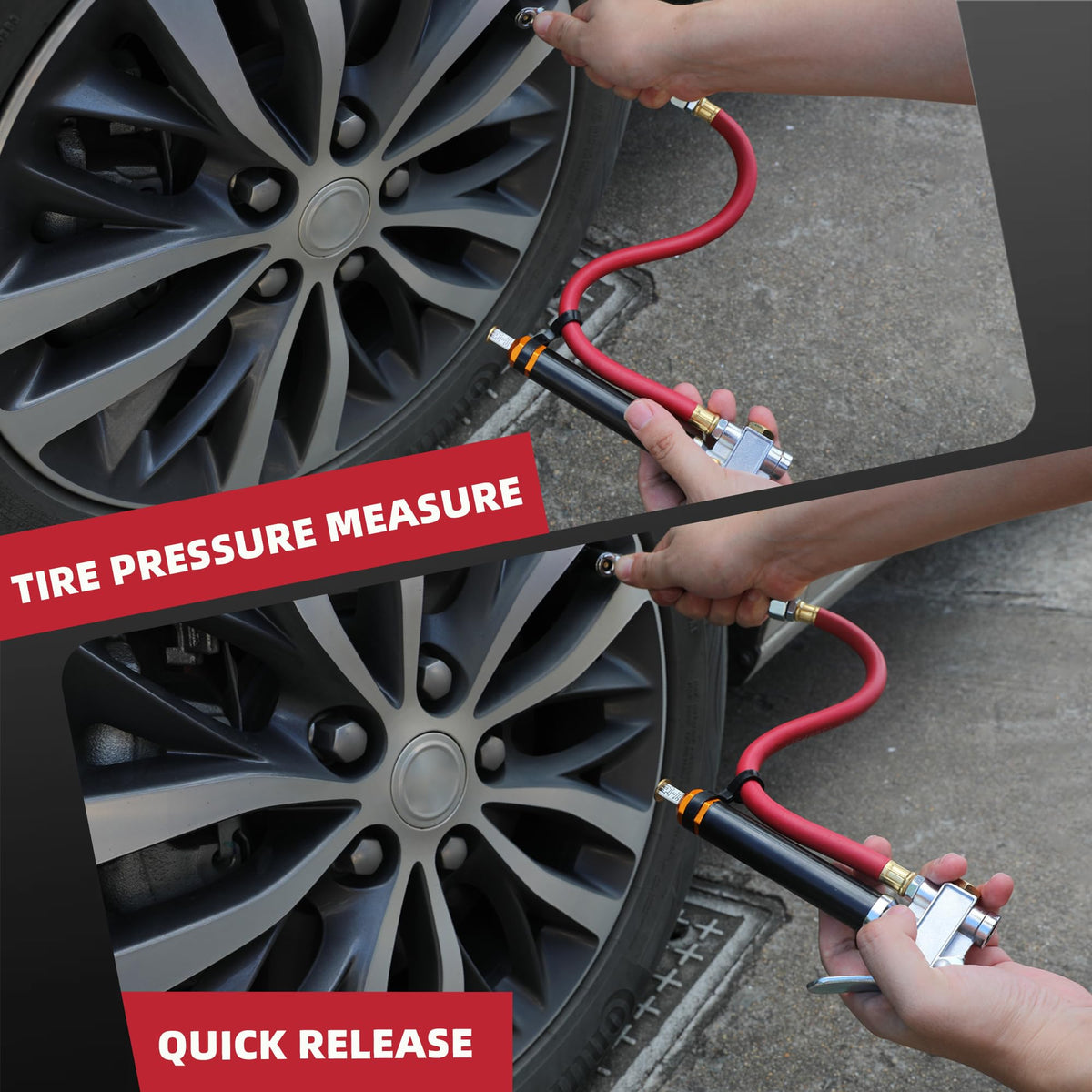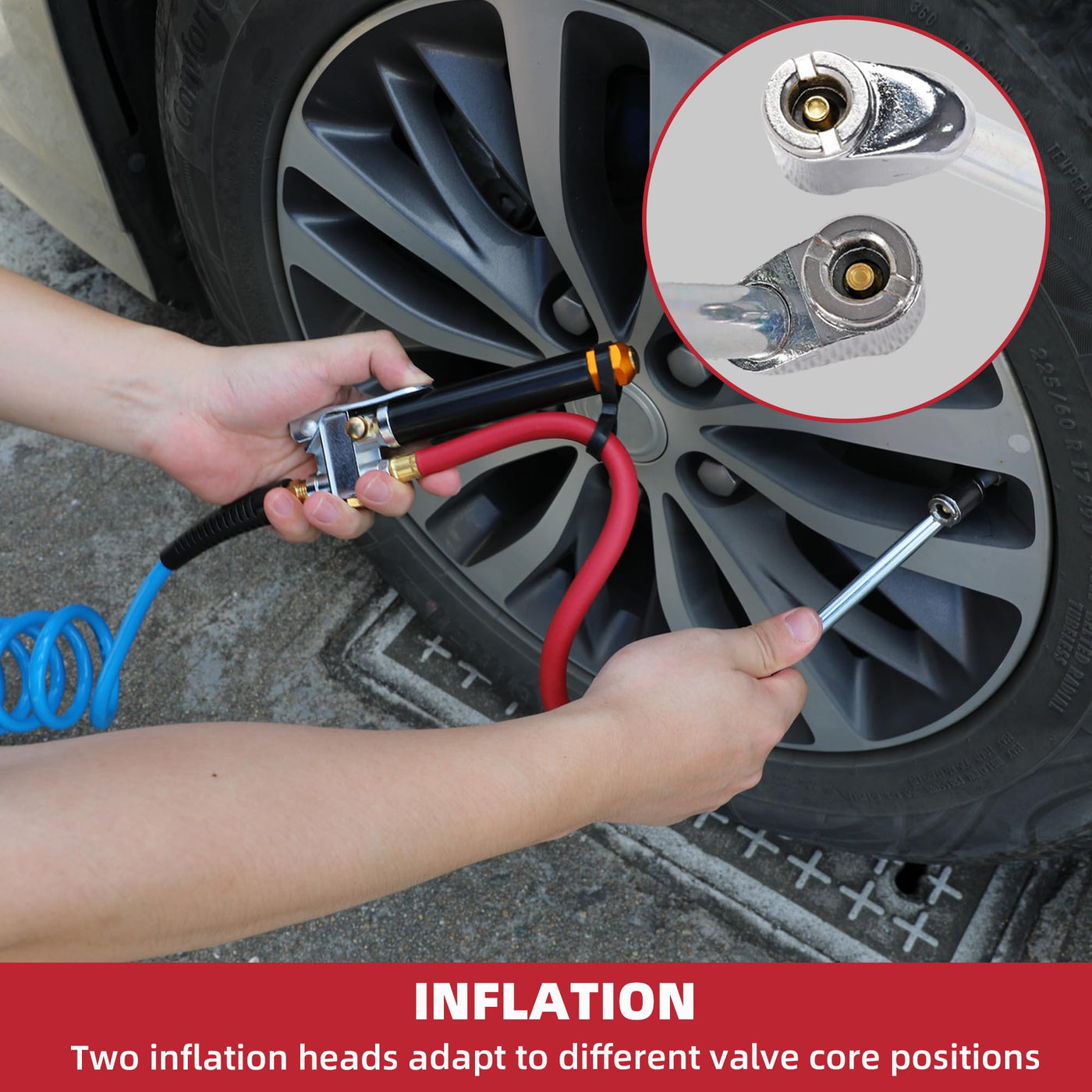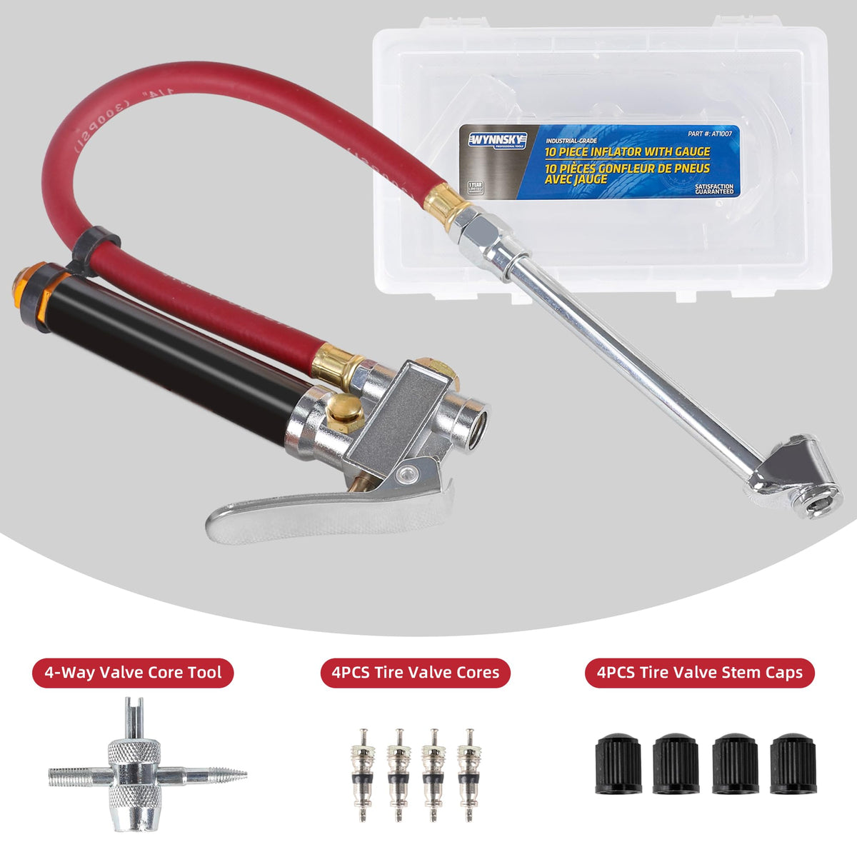 Description:This Is Our Wynnsky Tire Inflator Gauge Kit, Which Is Ideal For Industrial, Home, Or Shop Use. It Has Zinc Cast Alloy Body With Heavy Duty Brass Internal Parts, 6-Inch Chrome Plated Dual Head Chuck Also Included In The Package. And It Has An Easy To Read Pressure Gauge, Measures 20Psi To 120Psi And Has A 12 Inch Red Heavy Duty Flexible Air Hose With A Standard 1/4 Inch Npt Female Inlet. It Provides You With Easy And Controlled Inflation And Comes With A-Year Warranty. 1 Piece 4-Way Tool, 4 Piece Valve Cores, 4 Piece Plastic Caps Are All Included In The Case As A Gift For You. Believe Our Tire Inflator Gauge Will Serve You For A Long Time!1.12 Inch Heavy Duty Flexible Air Hose With Brass Fittings 2.Zinc Cast Alloy Body With Heavy Duty Brass Internal Parts For Long Life 3.Heavy Duty Tire Inflator For Industrial, Home, Or Shop Use 4.6-Inch Chrome Plated Dual Head Chuck 5.Easy-To-Read 20-120 Psi Tire Pressure Gauge, Standard 1/4 Inch Npt Female Inletinclude: 1 Piece Dual Foot Tire Inflator Gauge 1 Piece 4-Way Tool 4 Piece Valve Cores 4 Piece Plastic Caps 1 Piece Plastic Storage Box Company:Wynnsky Is A Professional Manufacturer Of Pneumatic Couplers & Plugs, Air Hose Fittings, Tire Repair And Tire Maintenance Products. We Save Customer'S Cost In Each Step Of Our Operation, With A Guarantee Of High-Quality And Reliability. We Deliver The Most Saving And Best Value To Our Customers. Choose The Wynnsky'S Products And You Will Never Worry About Overpaying Or Any After-Sales Service.If You Want To Know More About Our Products, Please Search Wynnsky On Amazon.