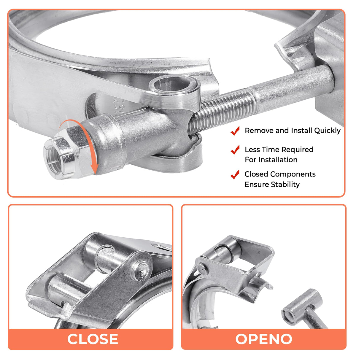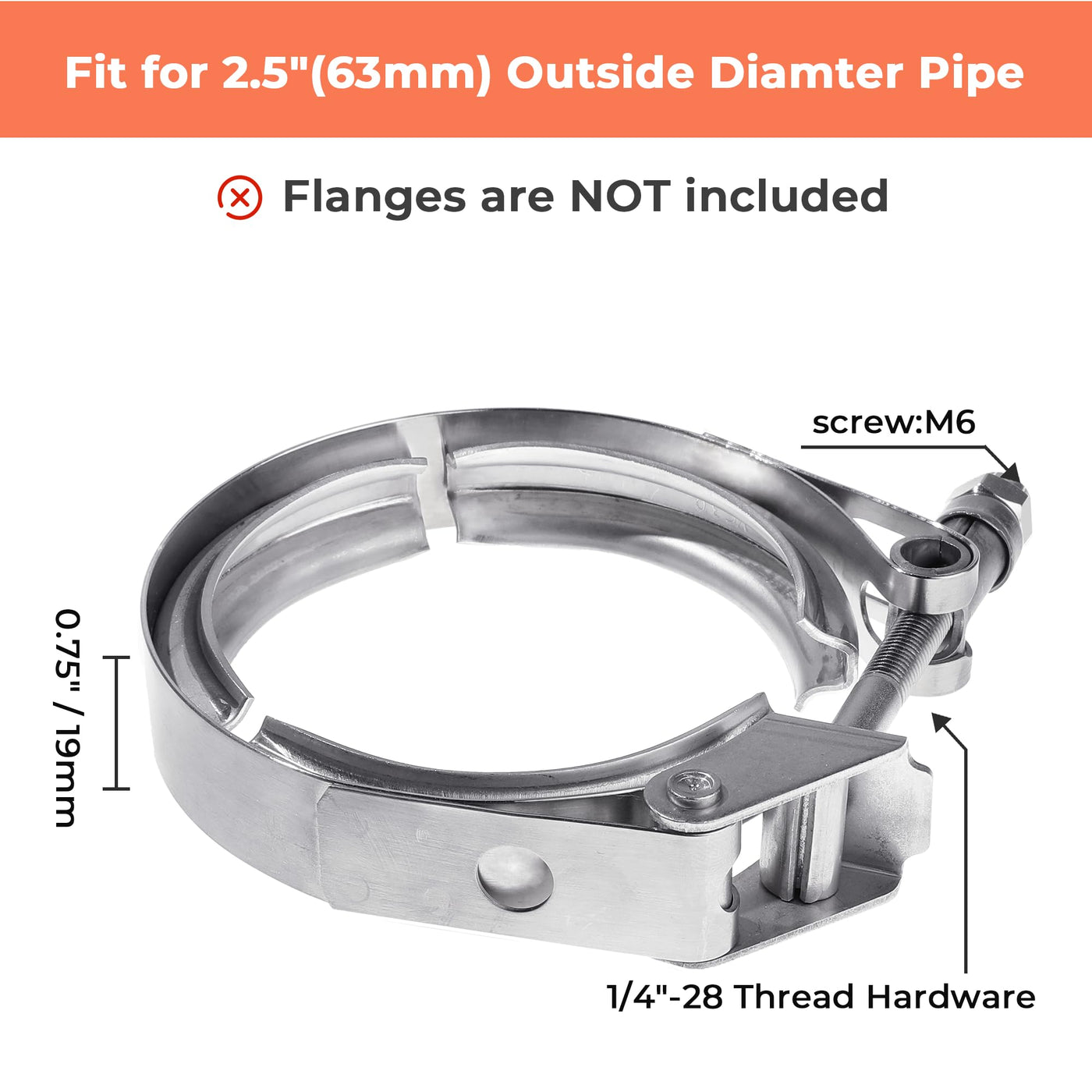 ?Suitable?This v clamp fits for 2.5'' ID v-band flanges. Fits for 3.5 inch OD pipes, make sure the size right. | ?Material?Crafted from high-quality 304 stainless steel, the V-band clamp ensures exceptional durability and resistance to corrosion, providing long-lasting performance even in demanding conditions. | ?Wide Application? The complete V-band kit is designed to meet a variety of needs, making it perfect for turbos, waste gates, blow-off valves, exhaust systems, and more. Great for racers and tuners. | ?Easy Disassembly?The V-band clamp offers seamless installation and removal, facilitating the setup and maintenance of intercooler systems and turbo components. Perfect for use with charge piping, intake pipes, and more. | ?A Variety Of Sizes?Multiple sizes of V Band clamps can meet your tightening needs of different sizes