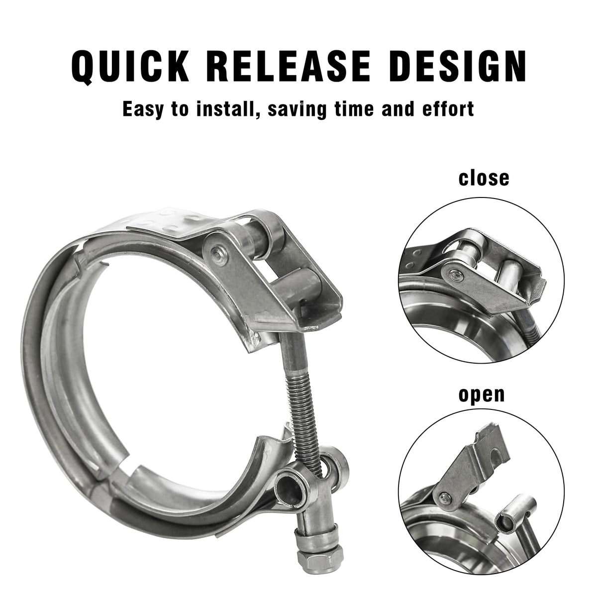 Introducing the WYSIWYKA 4 Inch Quick Release V Band Clamp, a high-quality exhaust pipe flange clamp kit designed for easy installation and removal of intercooler systems and turbine components. Constructed from professional-grade 304 stainless steel, these clamps are resistant to rust, high temperatures, and corrosion, ensuring a long-lasting and reliable performance. The smooth surface without burrs ensures a seamless fit and finish. This clamp is suitable for a variety of applications, including exhaust pipes, pumps, diesel engines, turbochargers, mufflers, intercoolers, and other equipment. With a range of sizes available, you can find the perfect fit for your tightening needs. The V-band kit allows for quick and easy connection or disconnection of sections of your exhaust by removing a single nut, making it ideal for applications requiring frequent removal.