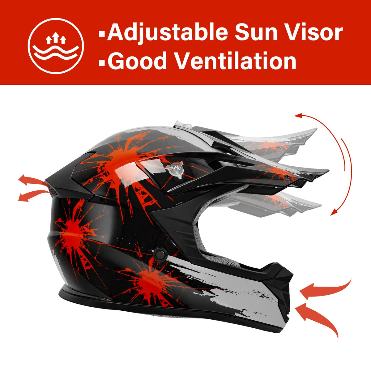 Xfmt Dot Youth Kids Motocross Offroad Street Dirt Bike Helmet Goggles Gloves Atv Mx Helmet, Black Red Firework