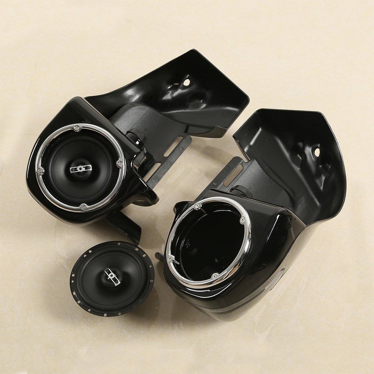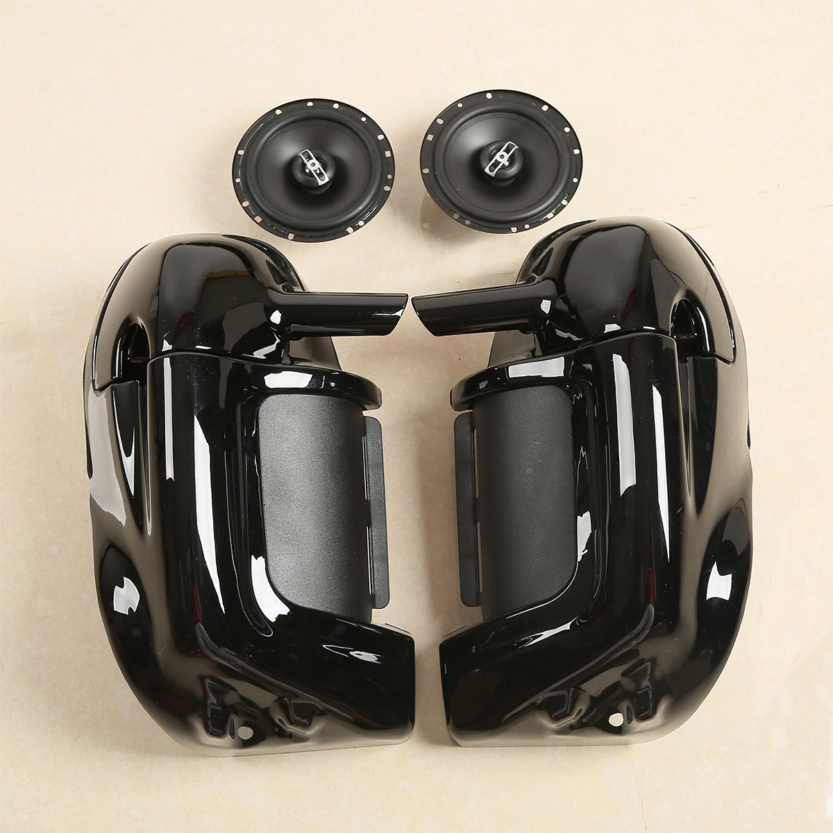 Q: Are the speakers included with the fairing good quality?A: Yes, the package includes 6.5" speakers that feature a powerful side magnet for deep bass and have specifications such as a 14.5 OZ magnet weight, 4Ω impedance, and a frequency range of 45HZ-22kHZ, ensuring high audio quality.