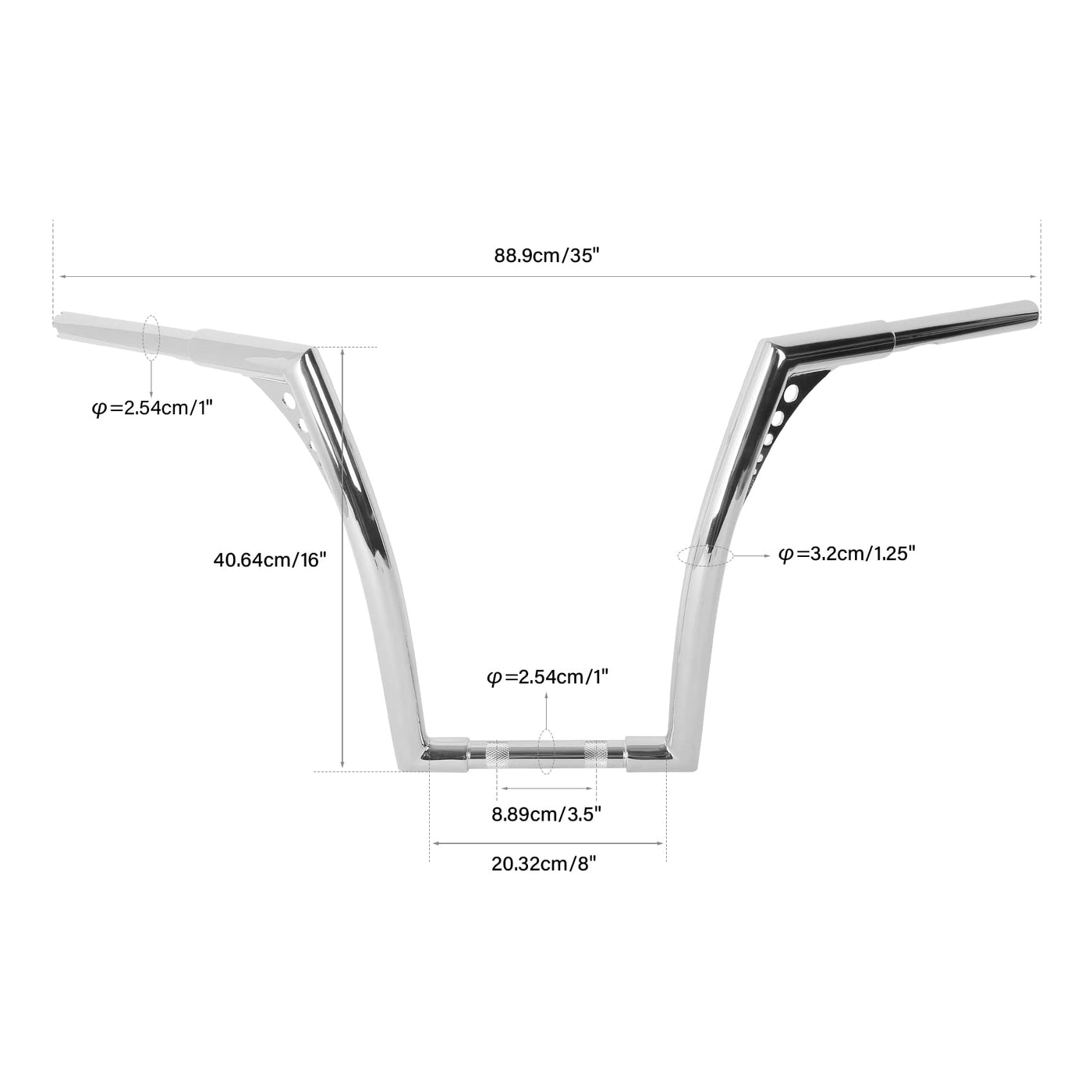 FEATURE: Aftermarket 100% Brand New Color: Chrome Material: Iron 16'' rise. 1 1/4''-diameter center section tapers to 1'' so that standard handlebar controls fit 34-1/2'' wide from tip to tip Come with drilled wiring holes Feature:High class quality and very durable,Good Working Condition and Easy to Install. FITMET: To fit All Harley-Davidson FLST, FXST, Sportster XL, including Throttle-by-wire models, and any Custom Application. NOTE: These Bar Do Not Fit 2015 2016 Road Glide. Buyer needs to check the application according to the measurement above. PACKAGE INCLUDED: 1 Handlebar