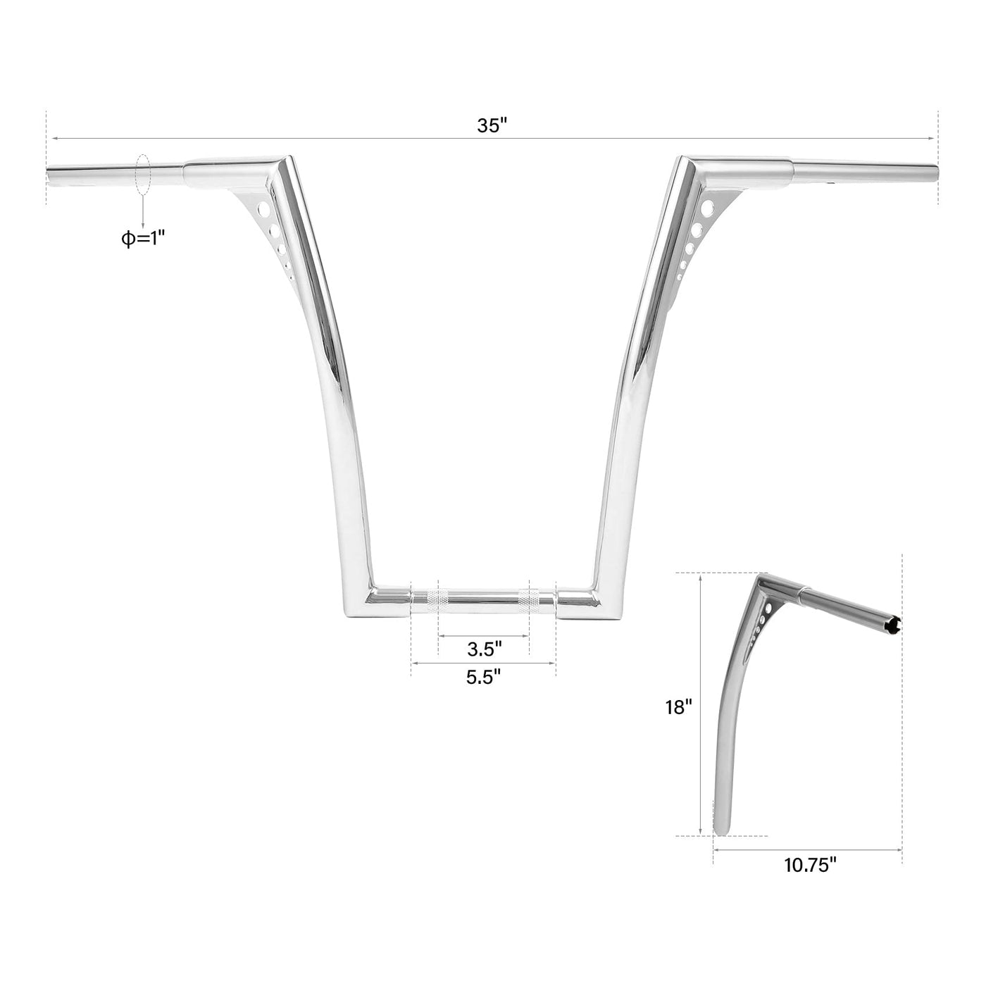 FEATURE: Aftermarket 100% brand new Material: Iron Color: Chrome Triple plated chrome! 18'' rise. 8'' backward sweep. 1-1/4'' diameter. Center section and tips taper to 1'' so that standard handlebar controls fit. 3-1/2'' on-center knurling for firm mounting. 34-1/2'' wide from tip to tip. Come with drilled wiring holes. Installation instructions not included. FITMET: Fits Harley-Davidson FLST, FXST and any custom application. PACKAGE INCLUDED: 1*18'' Rise Ape Hangers Handlebar