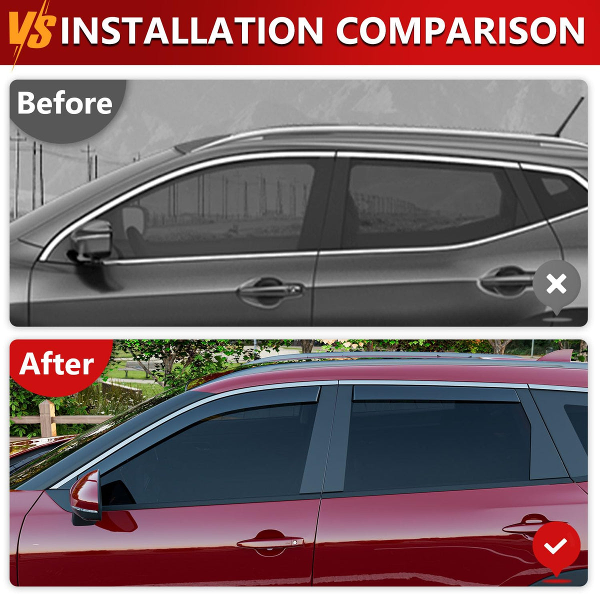 Fitment: Our deflector compatible with 2021 2022 2023 2024 2025 Nissan Rogue X-TRAIL rain deflector is designed according to the original model. It is compatible with Nissan Rogue 2025-2021 S, SV, SL, Platinum models. Attention: it is NOT replacement for Select&Sport&Hybrid models. Not only do these deflectors fit tightly, they also enhance the overall appearance of your vehicle. Please check your vehicle model carefully before placing an order. High-quality Material: The visor trim cover replacement for 2021-2025 Nissan Rogue side window visor deflector is made of hard, impact-resistant PC material, which is not easy to deform. It can effectively blocks rain, snow and sand in extreme weather to protect the car from damage. Additionally, it has excellent transparency, allowing you to enjoy a clear view even when the window visors are installed. It has no bad smell and is easy to clean. Function: This deflector compatible with 2021-2025 X-TRAIL window visor can protect window surface against rain and dirty. They can block most of the rain in rainy days, so as to prevent the interference of rain on driving, and improve the safety of driving in rainy days. Our window shades do not affect the normal opening and closing of windows, and increase the air flow inside the car, reducing the noise of window opening. They also solve your worries: without worrying about the noisy wind, chilly snow, annoying rain splashes, or the blazing sunshine. Easy to Install and Clean: The side window deflectors compatible with Nissan Rogue are easy to install, they come with double-sided tape so they can be directly pasted. Please wipe the installation area clean before installation and heat the double-sided tape with a hair dryer. It will greatly enhance the adhesion of the product. Do not touch water within 48 hours after installation. We have installation picture on our product homepage and in the instructions that come with your package. We provide professional installation guidance. Satisfactory Service: If you have any questions about our visor deflector replacement for 2021 2022 2023 2024 2025 Nissan Rogue X-TRAIL window deflector, please contact us, we are willing to solve your problem!