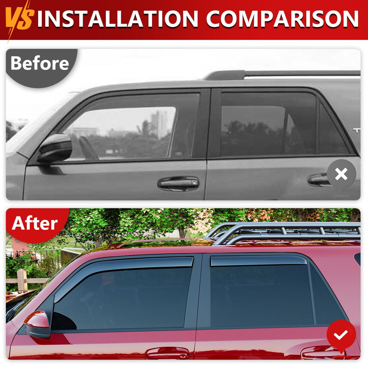 Fitment: Our deflector compatible with 2023 2024 2025 Honda CRV rain deflector is designed according to the original model. Not only do these deflectors fit tightly, they also enhance the overall appearance of your vehicle. Please check your vehicle model carefully before placing an order. High-quality Material: The visor trim cover replacement for 2023-2025 Honda CR-V side window visor deflector is made of hard, impact-resistant PC material, which is not easy to deform. It can effectively blocks rain, snow and sand in extreme weather to protect the car from damage. Additionally, it has excellent transparency, allowing you to enjoy a clear view even when the window visors are installed. It has no bad smell and is easy to clean. Function: This deflector compatible with 2023-2025 CR-V window visor can protect window surface against rain and dirty. They can block most of the rain in rainy days, so as to prevent the interference of rain on driving, and improve the safety of driving in rainy days. Our window shades do not affect the normal opening and closing of windows, and increase the air flow inside the car, reducing the noise of window opening. They also solve your worries: without worrying about the noisy wind, chilly snow, annoying rain splashes, or the blazing sunshine. Easy to Install and Clean: The side window deflectors compatible with Honda CRV 2025-2023 are easy to install, they come with double-sided tape so they can be directly pasted. Please wipe the installation area clean before installation and heat the double-sided tape with a hair dryer. It will greatly enhance the adhesion of the product. Do not touch water within 48 hours after installation. We have installation picture on our product homepage and in the instructions that come with your package. We provide professional installation guidance. Satisfactory Service: If you have any questions about our visor deflector replacement for 2023 2024 2025 Honda CR-V window deflector, please contact us, we are willing to solve your problem!