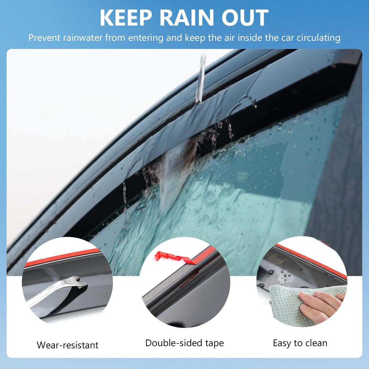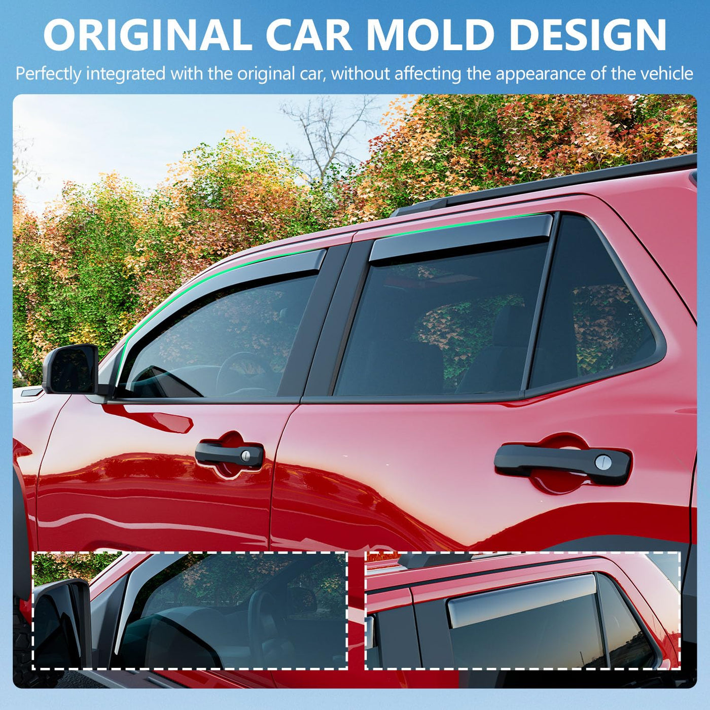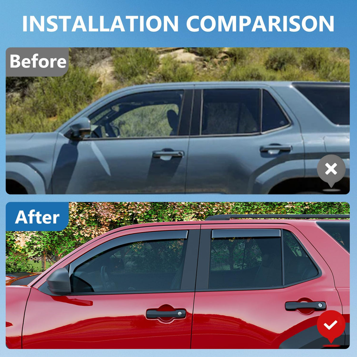Custom Fitment:The side window visor deflectors is designed according to the original car model. They are compatible with 2025 Toyota 4Runner rain deflectors. NOTE: They do not fit Hybrid models!!! Please check the vehicle model thoroughly before making a purchase. Premium Material:The deflectors compatible with 2025 Toyota 4Runner window visors are made of high quality PC material, which is strong and won't be easily deformed by collisions, and it has good heat resistance and works well at high temperatures. Multiple Function:The window visors replacement for 2025 4Runner side window visor deflectors are excellent for rainy or hot days. When it rains, it protects the window surfaces from getting stained by the rain, and it also prevents the rain from blocking your view. On hot days, it can effectively block the direct sunlight on the driver and prevent the window glass from breaking due to high temperature. Simple to Install:The side window visor deflectors compatible with 2025 4Runner window deflectors are easy to install. First, you need to wipe down the mounting locations, then use double-sided tape to stick them in the right place, and finally just press them firmly. If you need, you can use a hair dryer to heat the double sided tape to make it stick stronger. Do not touch water within 48 hours after installation. Satisfied Service:If you have any questions about window visors replacement for 2025 Toyota 4Runner window visor trim covers, please contact us at any time. We are here to offer you after-sales service to solve your problem.