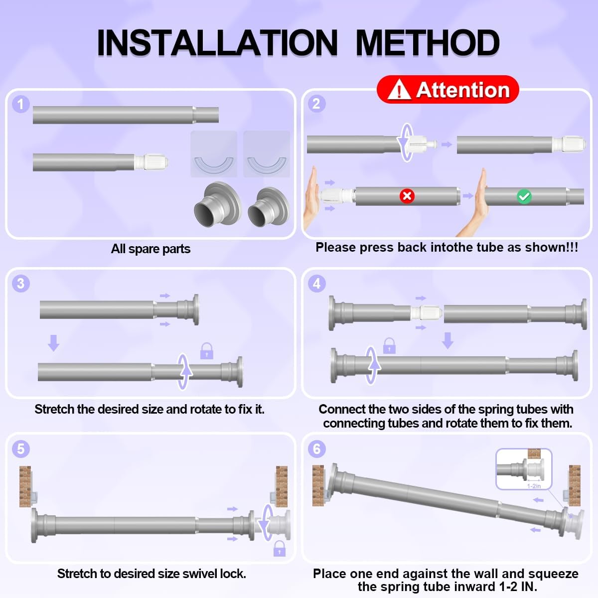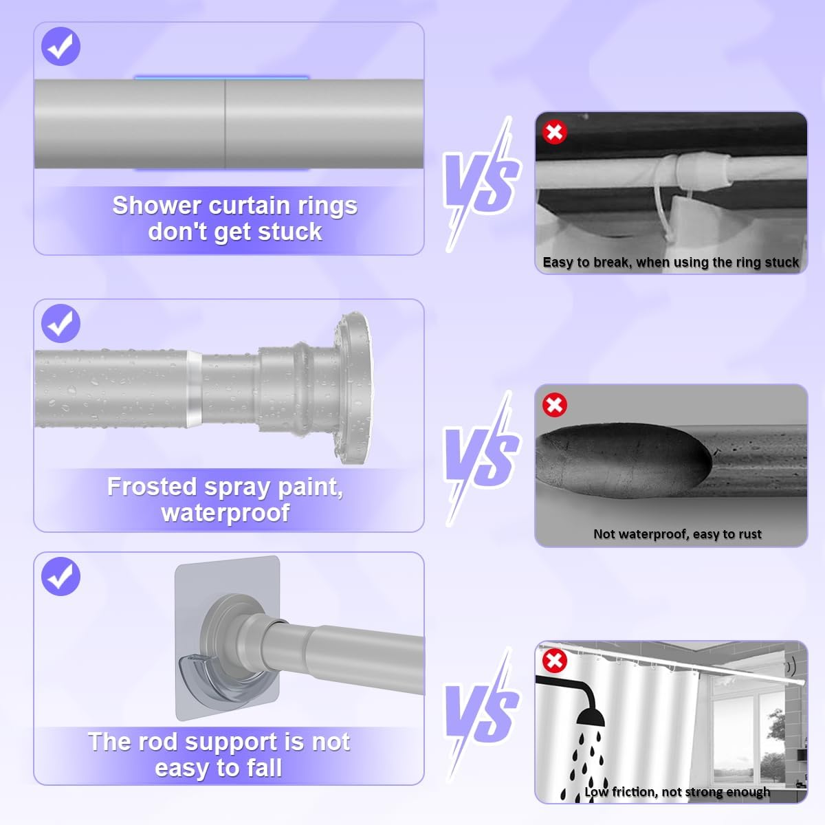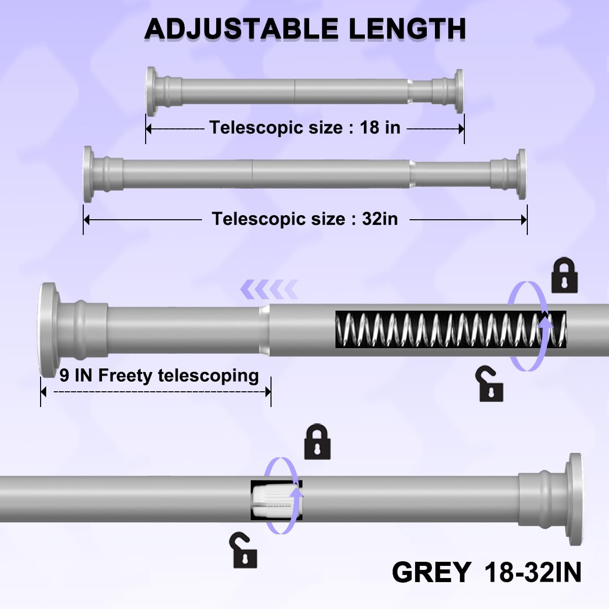 Adjustable Shower Rod:Our adjustable spring rod from 18'to 32'by splicing and telescoping,which can be easily adjusted to fit different spaces And can be used on smooth and rough surfaces,such as glass,wallpaper, painted walls,ceramic tile walls. | Heavy Duty Shower Curtain Rod:Our grey tension curtain rod upgraded spring,repeated tests customized spring,high temperature setting,good resilience. | Spring Tension Rod:Our tension curtain rod no drilling uses high strength springs inside.Custom quality materials increase tension, prevent deformation,increase support by 50%.You can also install it using shower rod holders by peeling and sticking it to the wall. | Rust Prevention:Our spring shower rod is made of stainless steel and have a high density paint sprayed on the surface to provide a double layer of protection.Suitable for bathroom and curtainas well as outdoors. | Installation Upgrade: Our small tension rod uses a new expansion screw splicing method and a rotating tube that stretches to a fixed length.We come with installation instructions as well as an installation video, if you have any questions you can contact us and we will endeavour to help you out!