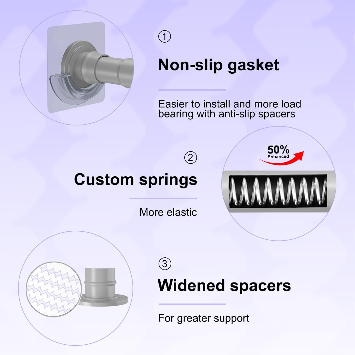 Q: How does the heavy-duty feature enhance the rod's performance?A: The heavy-duty design includes a customized spring that provides good resilience and increases support by 50%, ensuring it can hold heavier shower curtains securely.