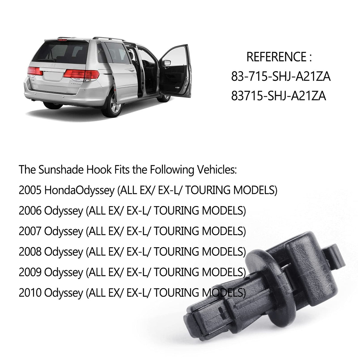 The Sunshade Hook Fits the Following Vehicles: 2005 HondaOdyssey (ALL EX/ EX-L/ TOURING MODELS) 2006 Odyssey (ALL EX/ EX-L/ TOURING MODELS) 2007 Odyssey (ALL EX/ EX-L/ TOURING MODELS) 2008 Odyssey (ALL EX/ EX-L/ TOURING MODELS) 2009 Odyssey (ALL EX/ EX-L/ TOURING MODELS) 2010 Odyssey (ALL EX/ EX-L/ TOURING MODELS) Replaces Part Numbers: 83715-SHJ-A21ZA 83-715-SHJ-A21ZA This is a compatible replacement part manufactured by Xislet Auto Parts. This Hook set is NOT a genuine part. Odyssey and Part Numbers are used in this listing only to identify the vehicles this sunshade hook fits.