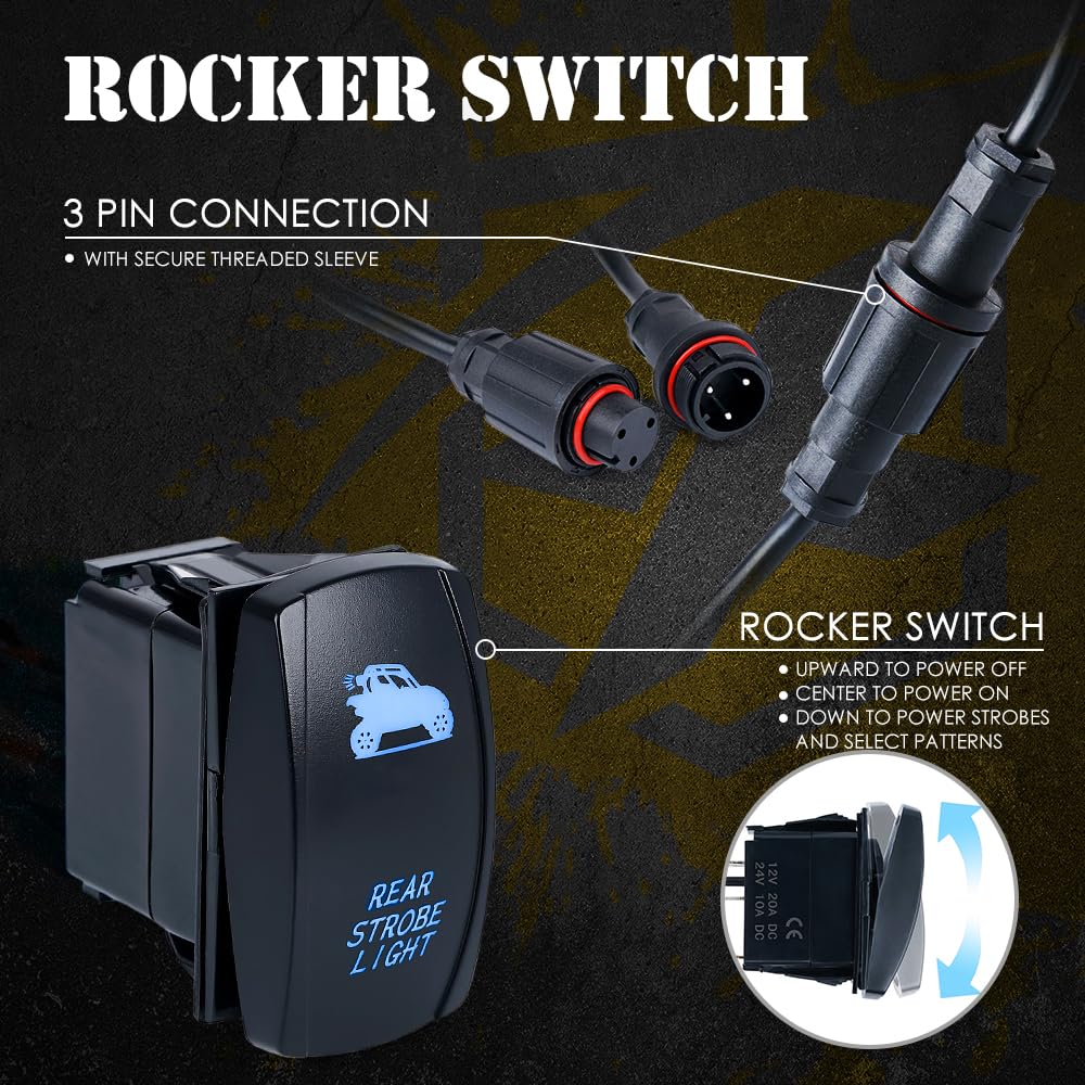 FEATURES - Xprite LED Strobe Chase Bar for Off-Road UTV ATV SXS has a Total of 6 Blocks and 6 High Power LEDs Per Block. Flood Lens Increase Visibility & Safety. You are Sure to be Seen in Fog, Rain, Snow, or any other weather condition. Can Endure Harsh Road Conditions and Extreme Weather. | FUNCTIONS & MODES - These Have Three Functions: Block 1 & 6 Running /Stop/Turn Signal Lights; Block 2 & 5 Strobe Lights; and Block 3 & 4 Lighting or Reverse Light. The strobe lights have 7 different patterns. | HIGH QUALITY - The Lens are Made of High Quality PC Plastic that is scratch resistant and shatterproof. Black Housing and Brackets are Shockproof and Corrosion-Resistant, Over 50,000 Hours Lifespan, Tough Enough to Stand Up Whatever The Road Throws at You! | ROCKER SWITCH - This off-road rear chase light bar includes rocker switch, upward center to turn on and off, down switch to change between 9 different strobe patterns. Independently control brake light, reverse light, and strobe patterns, turn strobe off by holding the strobe pattern switch for 3 seconds. | 2024 UPGRADE BRACKET DESIGN - 2024 Our chase light bar has added an adjustable bracket design, which seamlessly fits 1.75''-2'' roll cage, and supports up and down 180