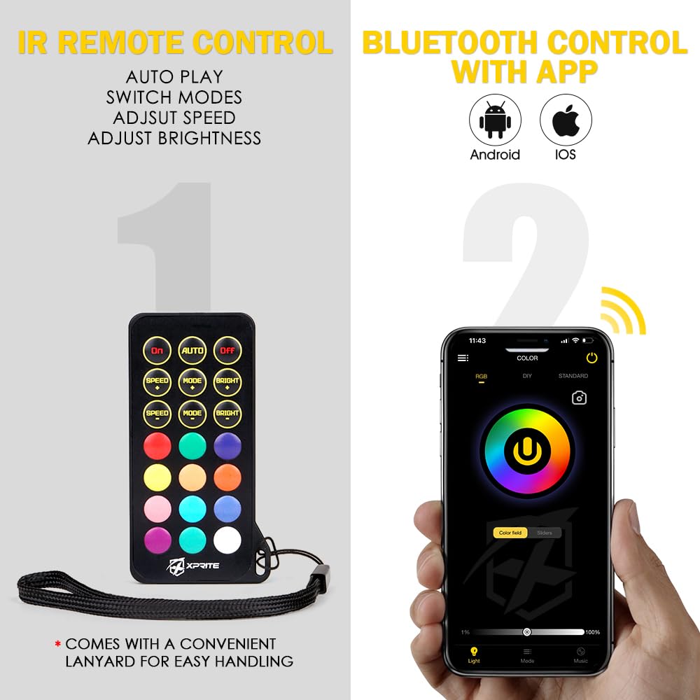 ?DUAL CONTROL OPTIONS?16million RGB color wheel adjustment APP control (support IOS and Android) + small size multi-function IR controller. Simple button operation, customize the speed, brightness, and colorful RGB colors of fog light. | ?HIGH-PERFORMANCE LED CHIP?Provides a Brighter, Crisper and Whiter Light Output, Closer to the Color Temperature of Daylight, Dramatically Improving Light Projection Distance and Overall Visibility.Includes Music Sync, Adjust Speed and Brightness! Over 50000 Hours Lifespan. | ?HIGH QUALITY COMPONENTS?Made of Durable DIE-Cast Aluminum Base and Polycarbonate Lens, Ribbed Design for Optimal Cooling ,Impact & Scratch Resistant.Sealed Housing. All Weather Design,Water-proof IP67. | ?EASY TO INSTALL??Plug & Play,Usually in 20 Minutes or Less. LED Ballast, LED CANBUS & H4/H13 Adapter Included for Headlight. Fog Lights Come with Conversion Adapter Wires. | ?FITMENT?Compatible with 2007 - 2018 Jeep Wrangler JK JKU Rubicon, Sport, Sahara, Unlimited 2 and 4 Door. NOTE: Compatible with 2017 - 2018 JKs with OEM LED Headlights will Require a Headlight Bracket for Installation (Sold Separately). #NOTE: Please check your local laws before purchasing. Xprite takes no responsibility for any illegal use.