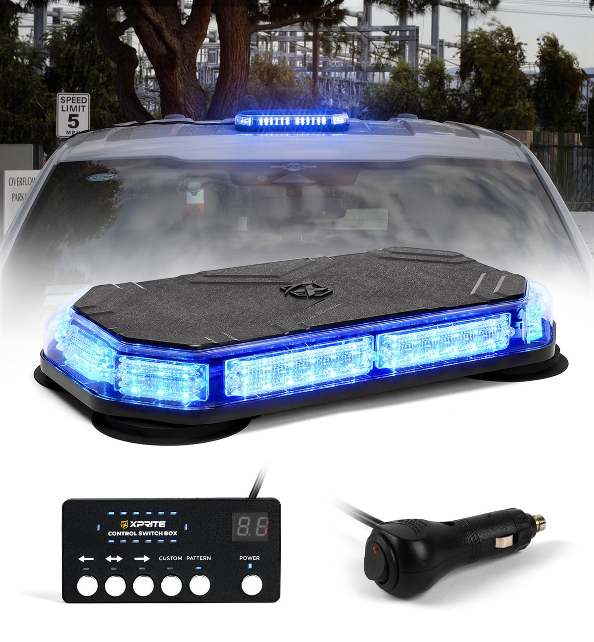 INDEPENDENT DESIGN - Xprite newest series rooftop strobe beacon light will make your vehicle distinctive. Unique pattern appearance, and upgraded strong robust design. Durable ABS housing, anti-scratch PC lens. Enclosed design that withstands harsh weather conditions. | X-BRIGHT: This emergency flashing lightbar has a total of 42 high-power LED chips. Crystal clear lens for max brightness, visible day and night. | TRAFFIC ADVISOR FUNCTION - Upgrade design, provides caution to potential upcoming hazards. Equipped a controller panel w/ display screen, easy to switch between 38 different strobe flashing modes, and quick-select buttons for 3 directional patterns, with last pattern memory recall and save one favorite pattern for quick respondent ever times. | HEAVY-DUTY MAGNETIC MOUNTS - Easily installs on any metal roof top, 4 strong magnetic feet with protective rubber padding with suction cup design for increased hold. Low-lying design, strong and easily carry. | YOUR AFTER-SALES SERVICE - If you are not satisfied with this strobe beacon light, please feel free to contact us by email.