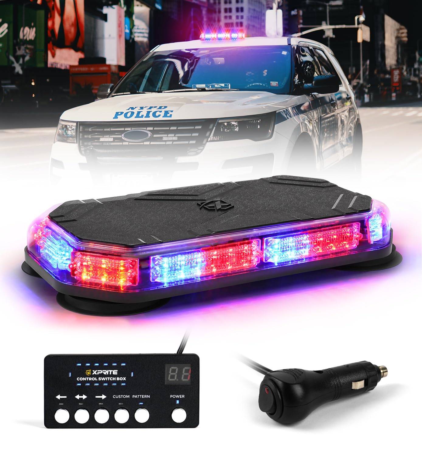 INDEPENDENT DESIGN - Xprite newest series rooftop strobe beacon light will make your vehicle distinctive. Unique pattern appearance, and upgraded strong robust design. Durable ABS housing, anti-scratch PC lens. Enclosed design that withstands harsh weather conditions. | X-BRIGHT: This emergency flashing lightbar has a total of 42 high-power LED chips. Crystal clear lens for max brightness, visible day and night. Great for law enforcement cars, plow trucks, construction vehicles, tractors, security, snowplow, postal, mail carrier, and city service workers, to warn of potential hazards. | TRAFFIC ADVISOR FUNCTION - Upgrade design, provides caution to potential upcoming hazards. Equipped a controller panel w/ display screen, easy to switch between 38 different strobe flashing modes, and quick-select buttons for 3 directional patterns, with last pattern memory recall and save one favorite pattern for quick respondent ever times. | HEAVY-DUTY MAGNETIC MOUNTS - Easily installs on any metal roof top, 4 strong magnetic feet with protective rubber padding with suction cup design for increased hold. Low-lying design, strong and easily carry. | YOUR AFTER-SALES SERVICE - If you are not satisfied with this strobe beacon light, please feel free to contact us by email.