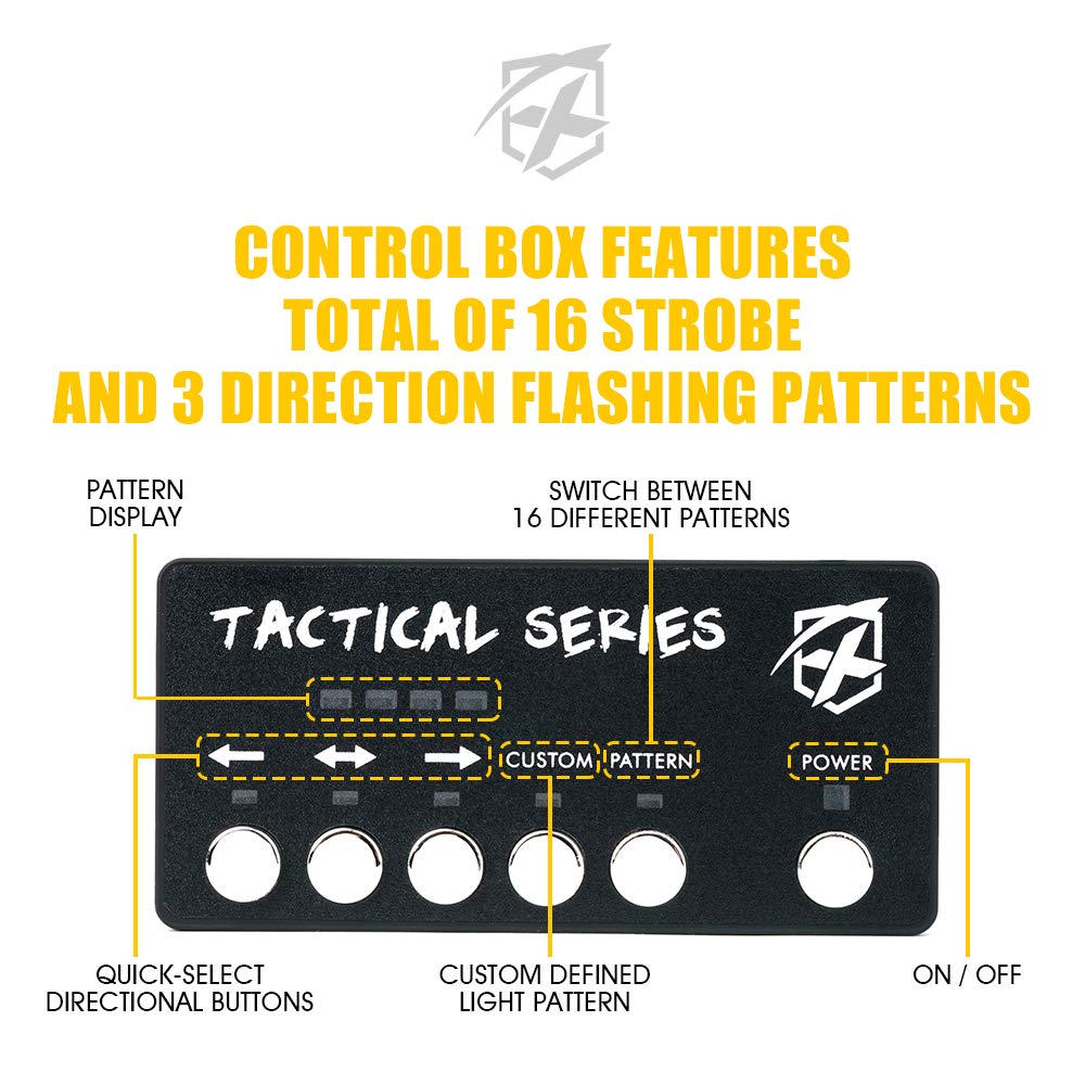 ?FEATURES? Our Tactical Series grille/marker strobe lights showcases an Ultra-Thin flush mount design, super bright lighting, and more eye-catching patterns to improve visibility and performance. | ?SUPER BRIGHT?12 High intensity LED chips with a flood lens provides maximum coverage and offers high visibility in day or night. Excellent brightness to improve better safety and security. | ?QUICK SELECT CONTROL SYSTEM? Upgraded design, Easy to switch between 16 different strobe and 3 buttons for directional patterns, with last pattern memory recall function. | ?HIGH-QUALITY? LED light head have an aluminum alloy base & durable PC Lens. Encapsulated electronics that are protected from outside elements, designed to withstand harsh weather conditions.(If the surface is not flat, extra clear silicone is recommeded) | ?EASY TO INSTALL? Protective mounting gaskets and screws are included for easy installation. Directly plugs into any vehicle with a standard 12V cigarette port. NOTE: 10FT Extension Cable Wire is Sold Separately, ASIN: B07XRQJTB2