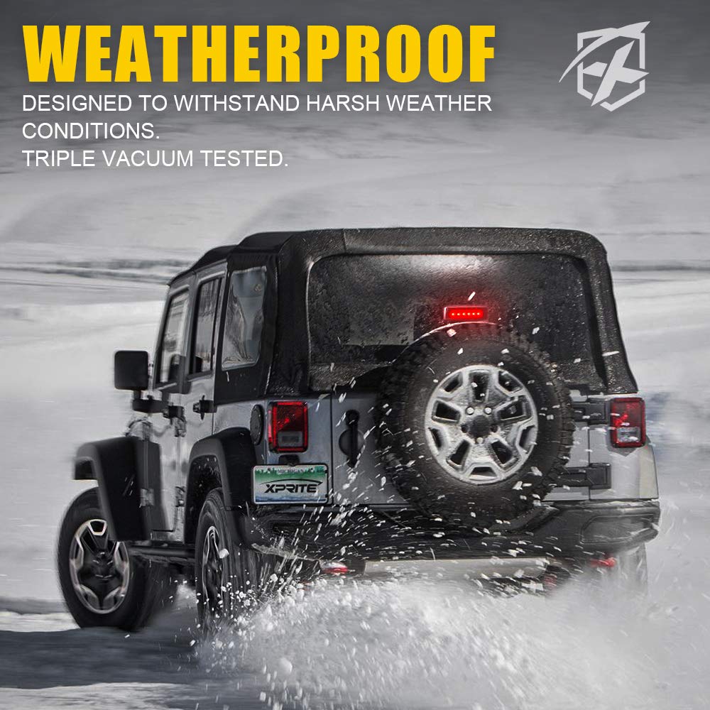 FEATURES - Xprite 3rd Brake Lights High Mount Stop Lamps Gives your car Incredible Visibility and Style. OEM Style LED is very Bright and has a Low Power Consumption. | LED CHIP - Quick ON/OFF Response. High Brightness and Low Heat LED. The Lights Penetration More Stronger and Farther.Up to 50,000 Hours Life. | MATERIAL - Durable PC Material, Great Light Projection and Excellent Transparency Lens. The Base Made of High Quality Light-Weight ABS Plastic. | WEATHERPROOF - Designed to Withstand Harsh Weather Condition. All-weather Design is Triple Vacuum Tested. Waterpoof Rate: IP68 | EASY INSTALLATION - Plug and Play. No Drilling Required. Compatible with 2007 - 2018 Jeep Wrangler JK 2/4 Door, Unlimited, Rubicon, Sahara, Sport.