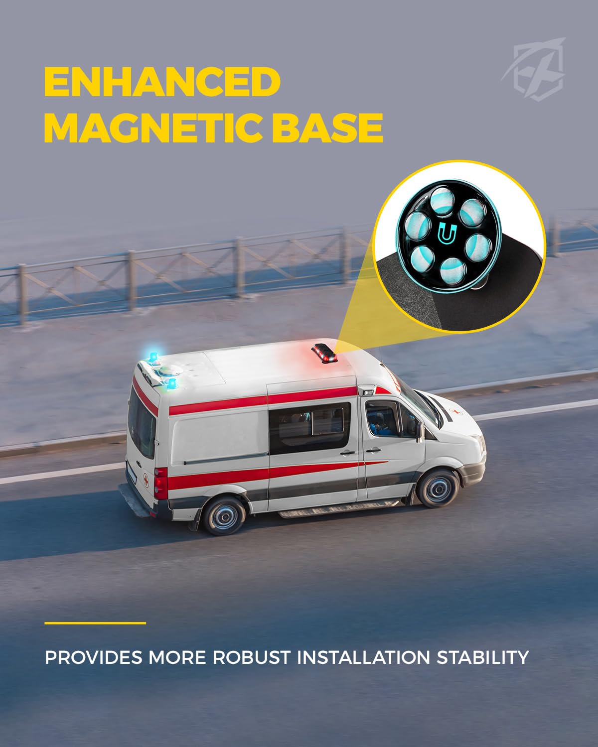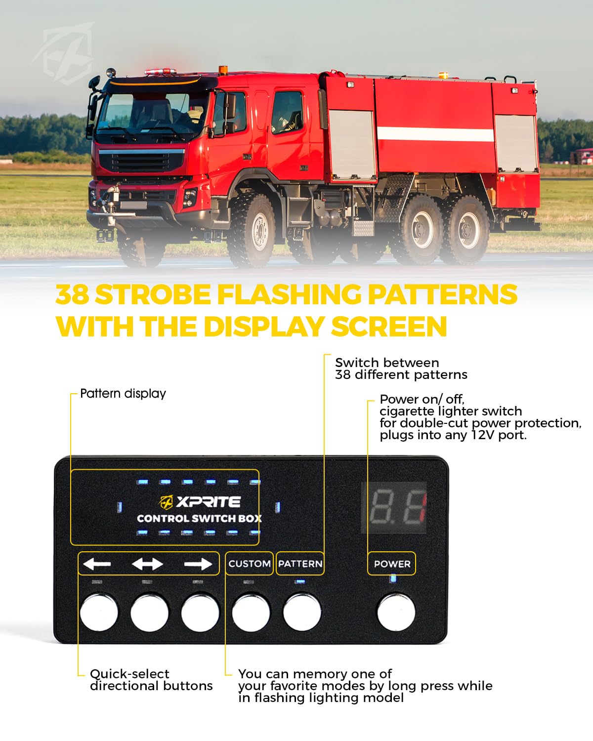 INDEPENDENT DESIGN - Xprite newest series rooftop strobe beacon light will make your vehicle distinctive. Unique pattern appearance, and upgraded strong robust design. Durable ABS housing, anti-scratch PC lens. Enclosed design that withstands harsh weather conditions. | X-BRIGHT: This emergency flashing lightbar has a total of 42 high-power LED chips. Crystal clear lens for max brightness, visible day and night. Great for law enforcement cars, plow trucks, construction vehicles, tractors, security, snowplow, postal, mail carrier, and city service workers, to warn of potential hazards. | TRAFFIC ADVISOR FUNCTION - Upgrade design, provides caution to potential upcoming hazards. Equipped a controller panel w/ display screen, easy to switch between 38 different strobe flashing modes, and quick-select buttons for 3 directional patterns, with last pattern memory recall and save one favorite pattern for quick respondent ever times. | HEAVY-DUTY MAGNETIC MOUNTS - Easily installs on any metal roof top, 4 strong magnetic feet with protective rubber padding with suction cup design for increased hold. The cable can be wrapped around the magnet supports for clean storage. | YOUR AFTER-SALES SERVICE - If you are not satisfied with this strobe beacon light, please feel free to contact us by email.