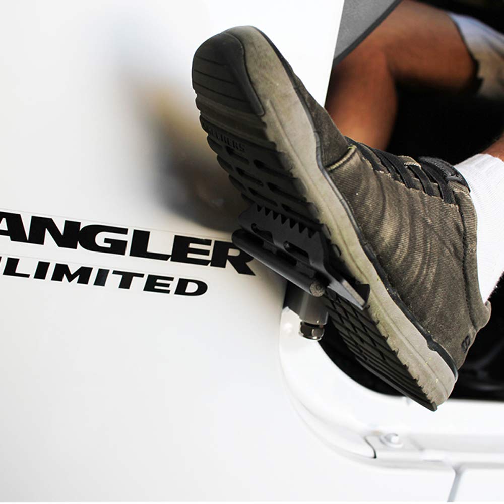 Freedom of Door-less Driving - Enjoy the freedom of driving a door-less with these innovative foot pegs. Relax and feel the breeze with your legs stretched out, complementing your car's sleek look. | Premium Construction - The jk door pegs are constructed of stainless steel with a matte black powder coat for durability. Features rubber bumper for paint protection and one-piece welded design for longevity. | Anti-Skid Strip Design - Prevent slipping, especially in muddy or wet conditions, with the anti-skid strip design for doors off foot pegs. Approx 10mm thread diameter ensures a secure foothold on the front driver and passenger sides. | Effortless Installation - No drilling or modifications necessary. Mounts directly into the bottom door hinge, seamlessly integrating with the wrangler foot rest for hassle-free setup. (Wrench may be needed for door removal initially). | Fitment - Compatible with 2007-2018 Jeep Wrangler JK 2DR and JKU 4DR models without doors. (Note: Tight nuts may be required to fix foot pegs in certain positions).