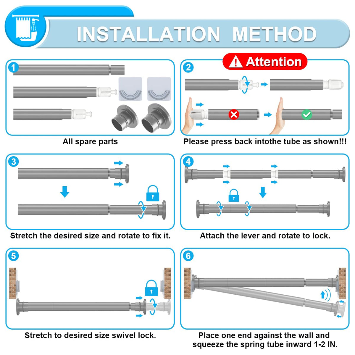 Spring Tension Rod: Our shower curtain rod uses customized high-quality springs inside to prevent deformation and increase support by 50% without tilting or sliding. In addition, two brackets greatly increase the load-bearing capacity | Adjustable Shower Rod: Our tension curtain rod can be adjusted from 28 'to 48' through splicing and extension, making it easy to fit different spaces. It can be used on smooth and rough surfaces such as glass, wallpaper, painted walls, tile walls, etc. | Rust Prevention: Our tension rod for windows is made of stainless steel and coated with high-density paint on the surface, providing double-layer protection. | Installation Instructions: This small shower rod includes 3 tubes, a spring tube, and 2 connecting tubes of different lengths. Pull out the inner rod of the spring to the desired length, then twist the rod to lock it, and connect the other connecting tubes. The specific method can be found in the pictures and videos on the website | Widely Applicable: Our extendable pole for bathroom can be used for small-sized positions such as doorways, windows, kitchens, bathrooms, etc. Please choose according to your actual usage scenario.