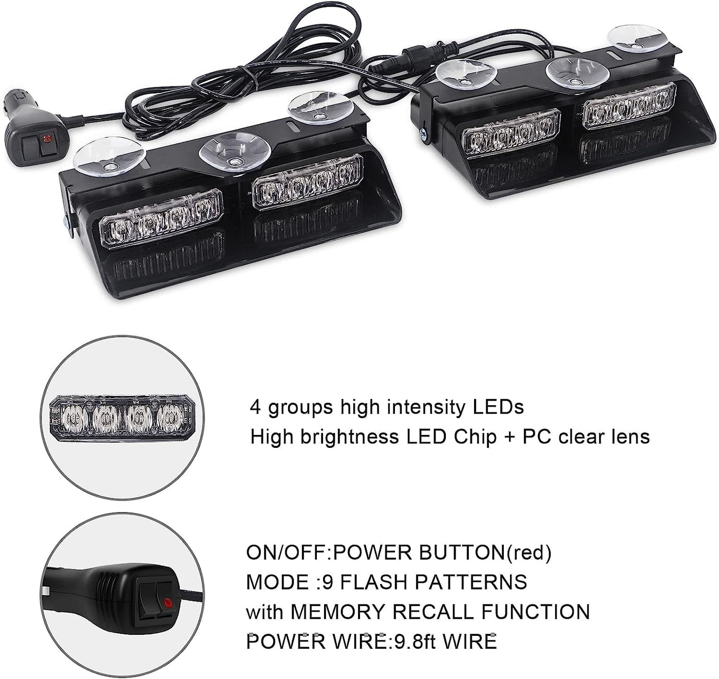 WIDE USAGES This front/rear windshield strobe lights is perfect for use in fog, rainy, snowy, sandstorm and mud wind season ideal and emergency situations, with durable and bright light. SPECIFICATION Dimensions : 7.16''x 4.1''x 1.26''/182x105x32mm (LxWxH) Working voltage: 12V LED Source: 16W (1W/LED) Flash modes: 9 different strobe/flash patterns, last memory recall. Power Cable: 9.8FT cable with cigarette plug power controller. Weight: 0.6kg/1.32lb. Lifetime: Over 50,000 hours lifetime. PACKAGE INCLUDED 2 x 8 LED dash strobe lights 2 x U-Shaped Bracket 4 x fixed screws 6 x suction cups 1 x 12V cigarette plug